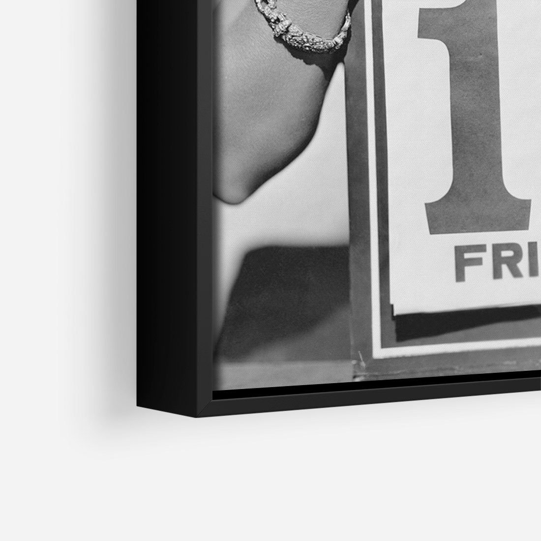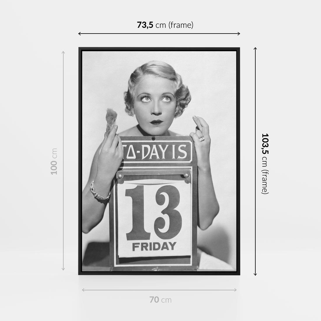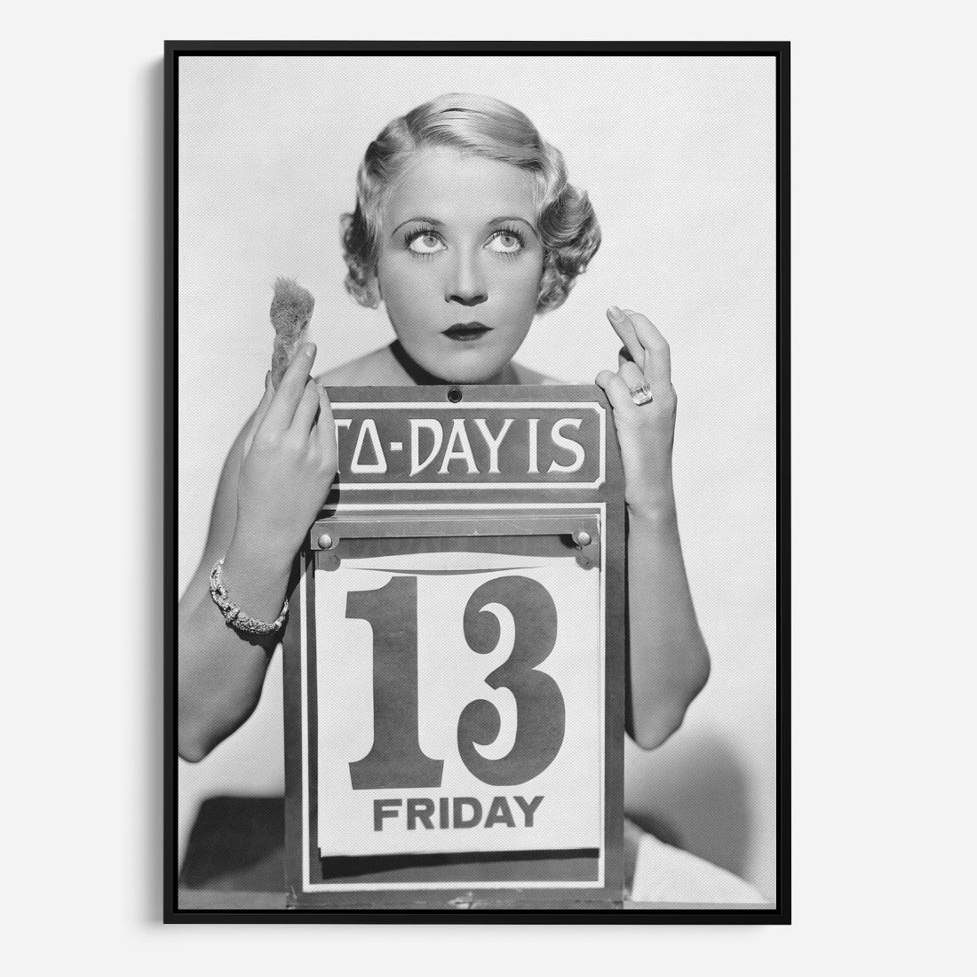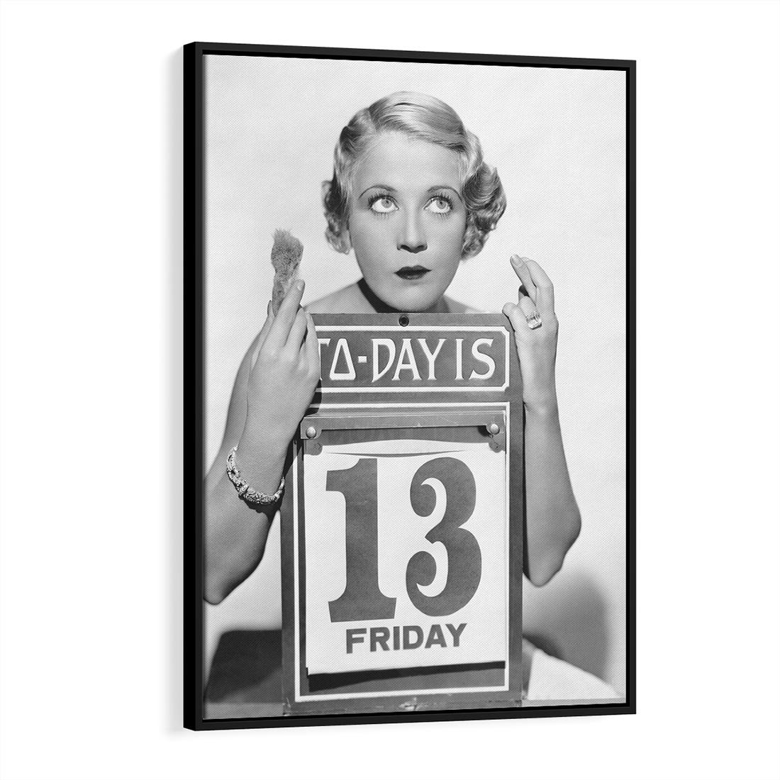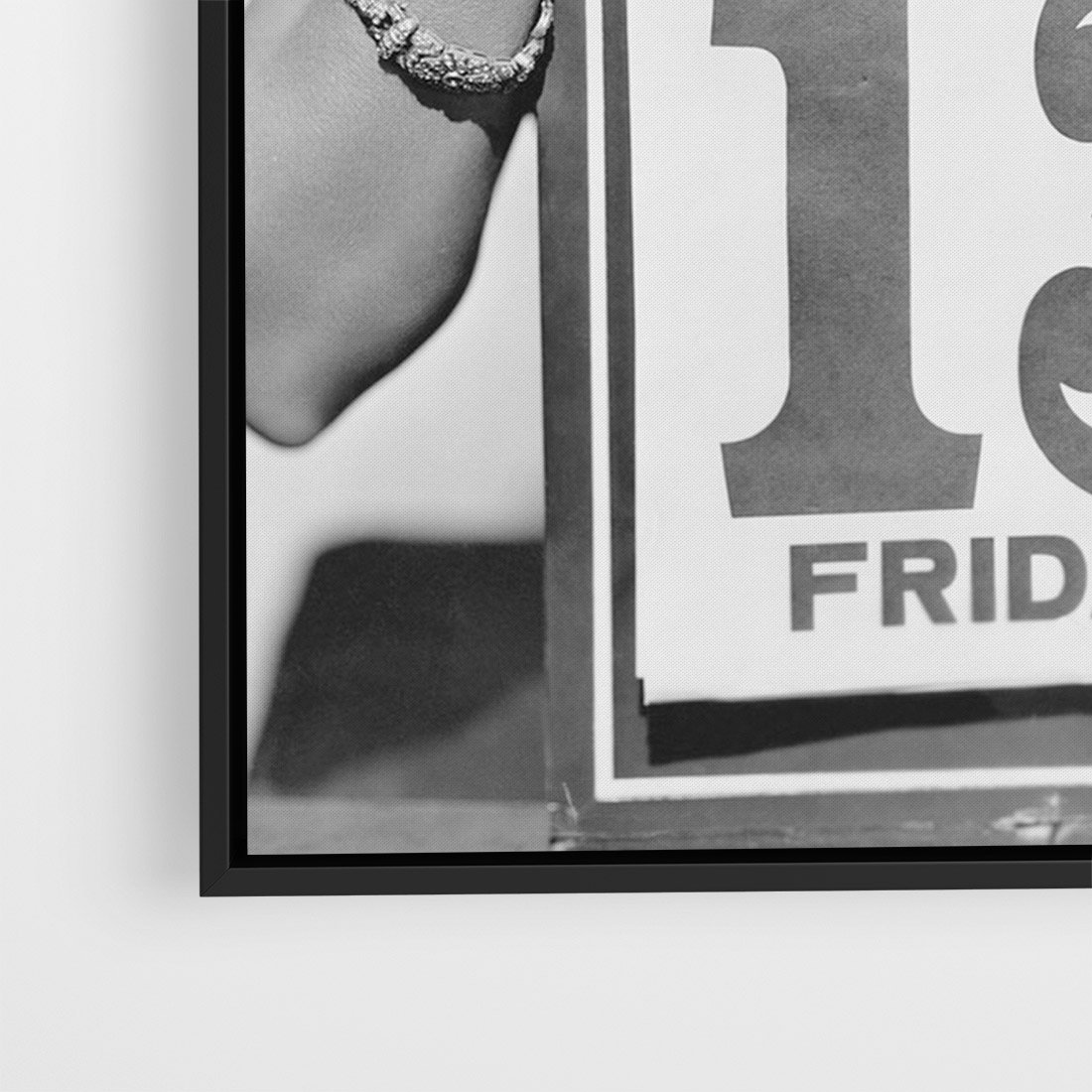 To urokliwe retro zdjęcie w czerni i bieli przenosi nas w czasie do epoki stylu pin-up. Na fotografii widoczna jest kobieta trzymająca tablicę z kalendarzem, na którym wyróżniony jest dzień piątek 13. To ikoniczne połączenie stylu pin-up z elementem niesamowitości dnia 13-tego stwarza niezwykłą atmosferę tajemniczości i humoru. Ten obraz będzie fascynującą ozdobą, która przyciągnie uwagę i wywoła uśmiech u każdego, kto go zobaczy.