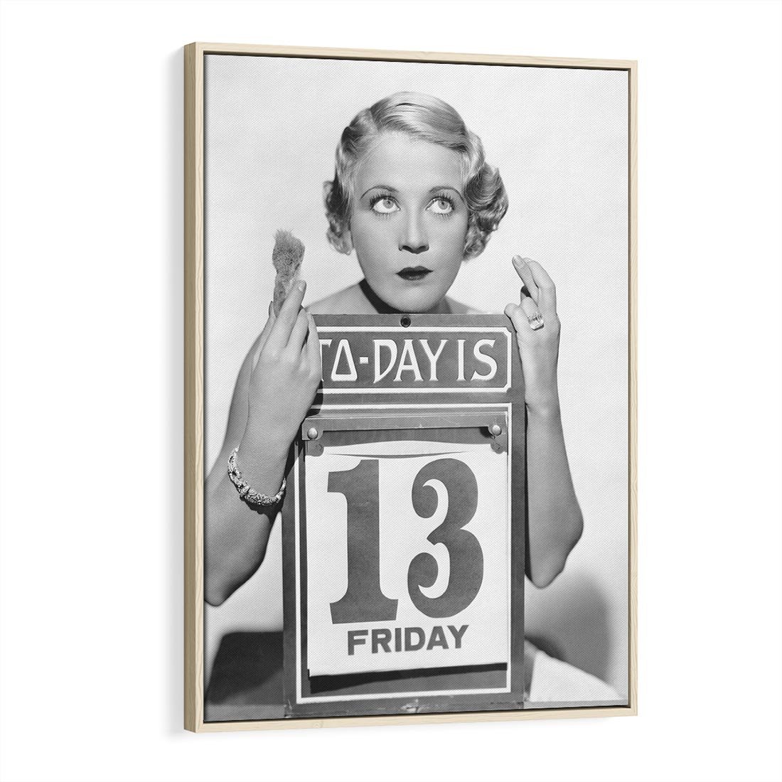 To urokliwe retro zdjęcie w czerni i bieli przenosi nas w czasie do epoki stylu pin-up. Na fotografii widoczna jest kobieta trzymająca tablicę z kalendarzem, na którym wyróżniony jest dzień piątek 13. To ikoniczne połączenie stylu pin-up z elementem niesamowitości dnia 13-tego stwarza niezwykłą atmosferę tajemniczości i humoru. Ten obraz będzie fascynującą ozdobą, która przyciągnie uwagę i wywoła uśmiech u każdego, kto go zobaczy.