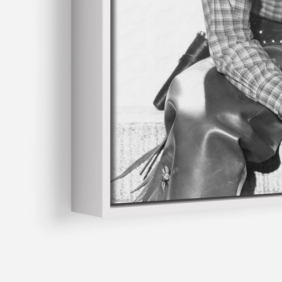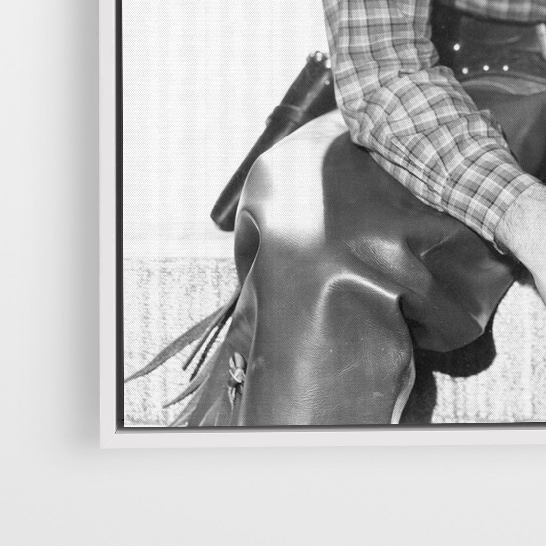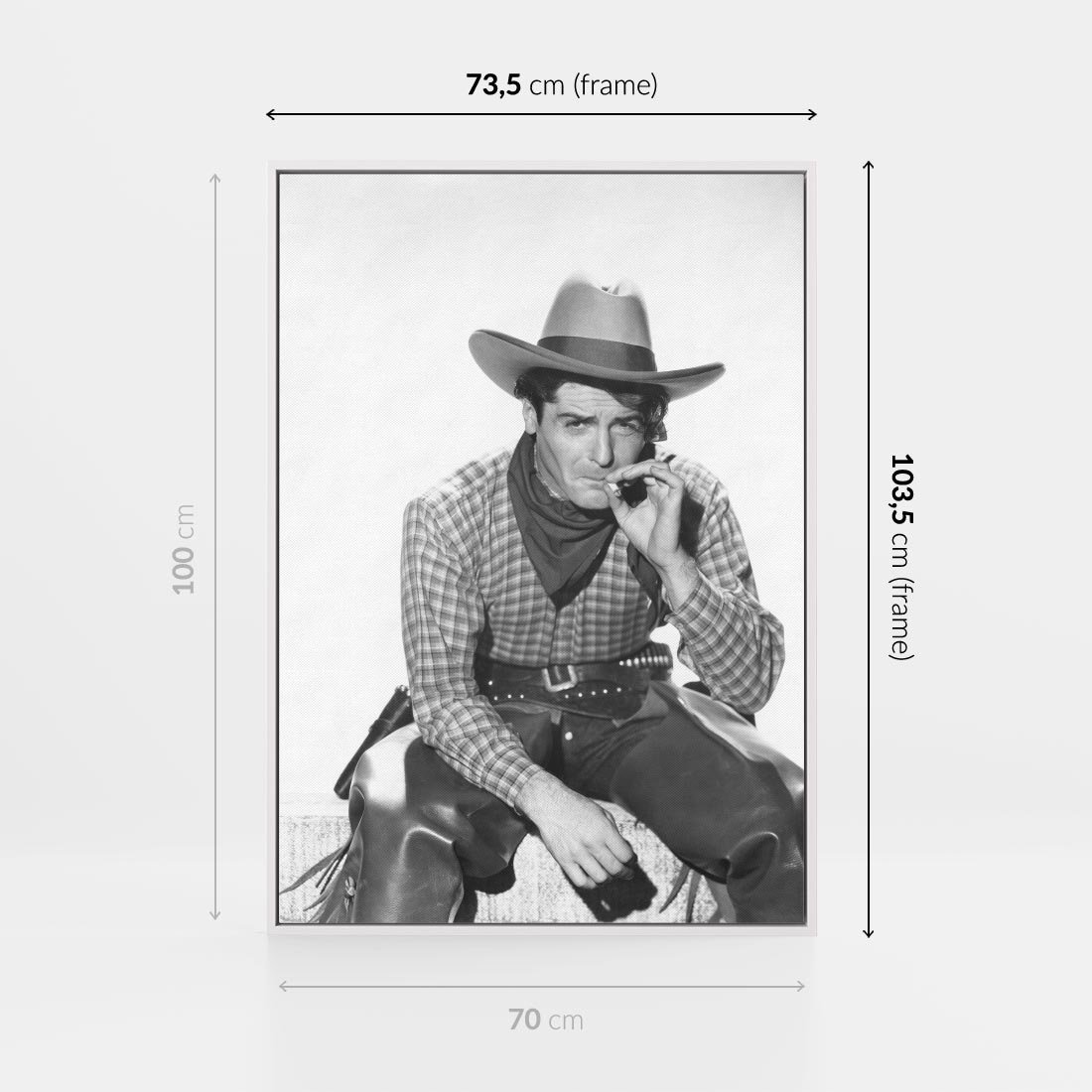 To czarno-białe retro zdjęcie ukazuje mężczyznę w kowbojskim stylu. Jest to hołd dla dziedzictwa kowbojskiego i epoki westernu. Zdjęcie emanuje męską siłą i niezależnością, przywołując obrazy rozległych preriów, koni i przygód na Dzikim Zachodzie. Idealnie nadaje się jako ozdoba dla miłośników westernu i fanów stylu retro.