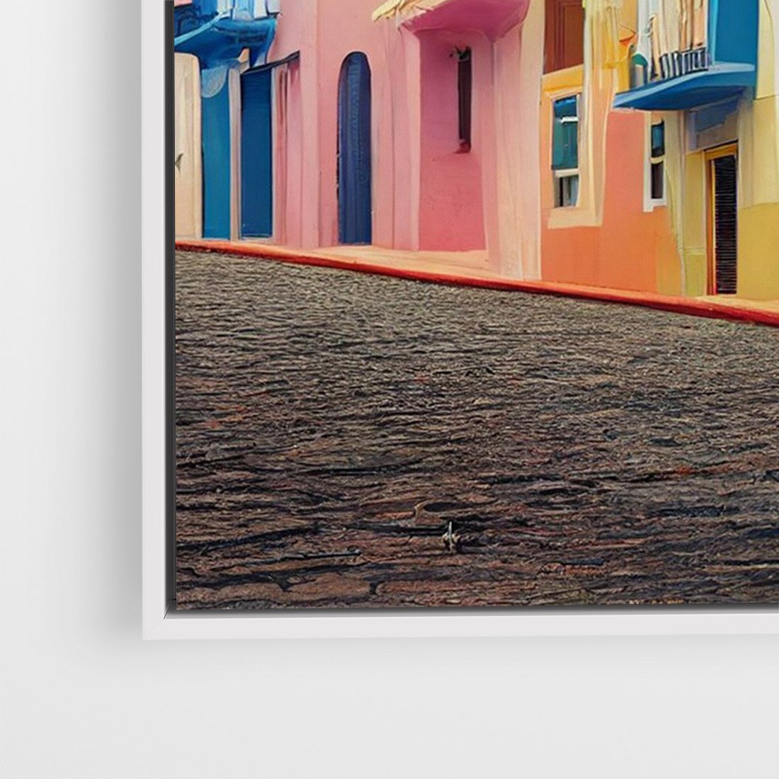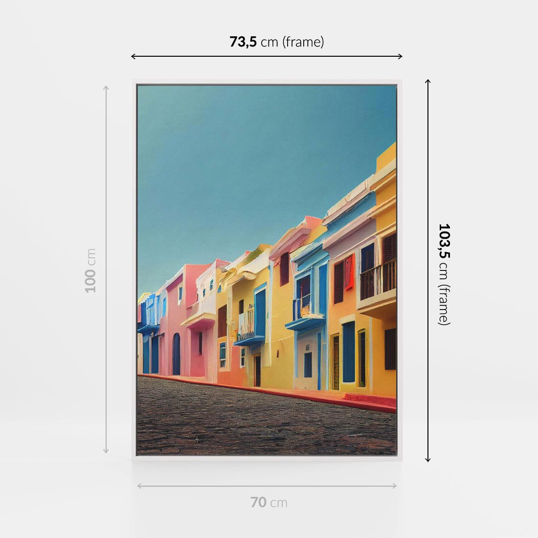 Obraz w ramie 70x100 - Ekspresja marzeń i tęsknot - pastelowe kolorowe budynki, wzdłuż ulicy - rama biała