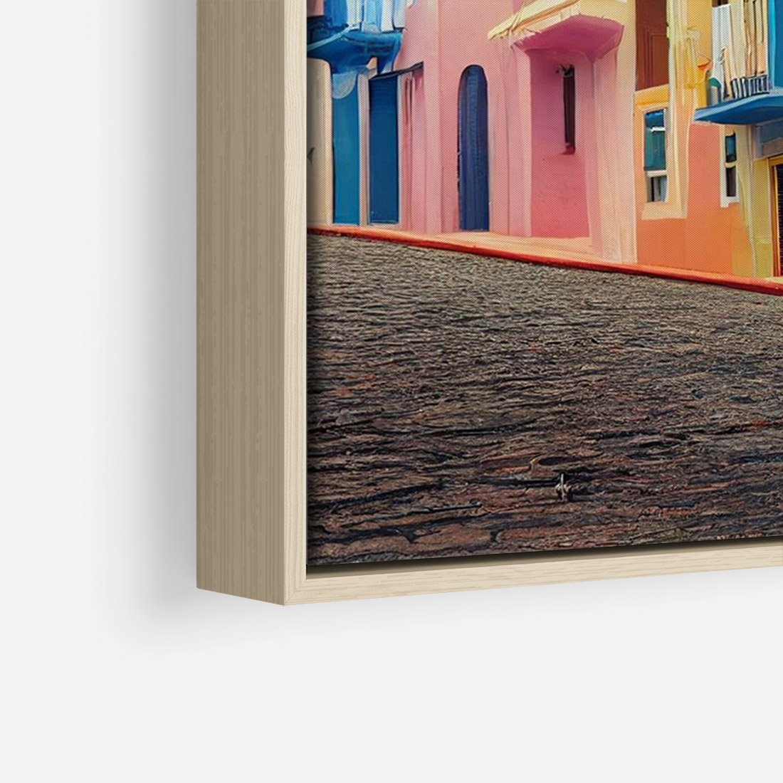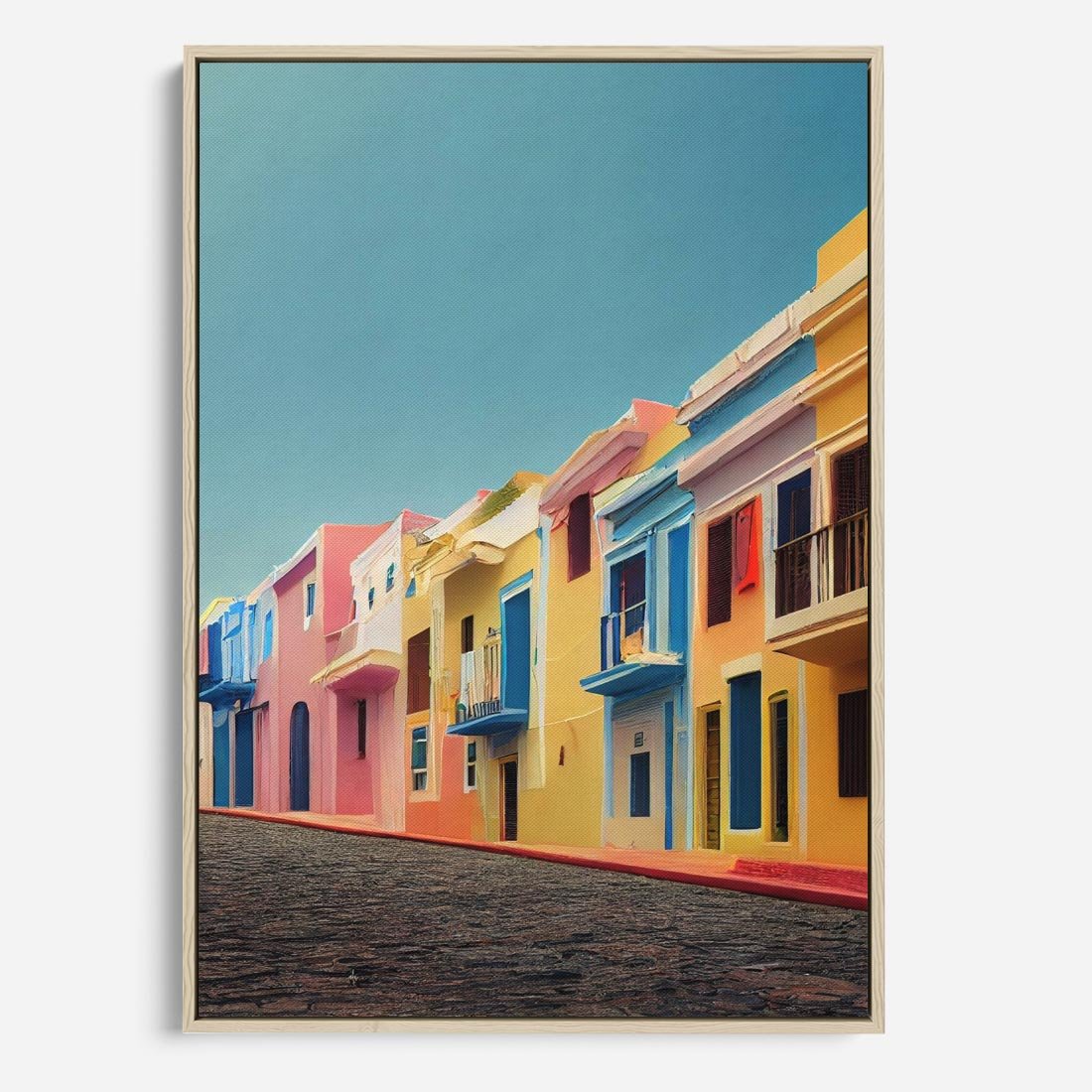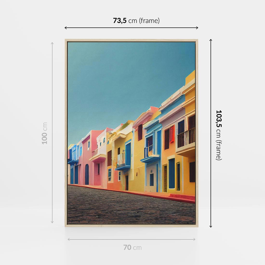 Obraz w ramie 70x100 - Ekspresja marzeń i tęsknot - pastelowe kolorowe budynki, wzdłuż ulicy - rama drewno