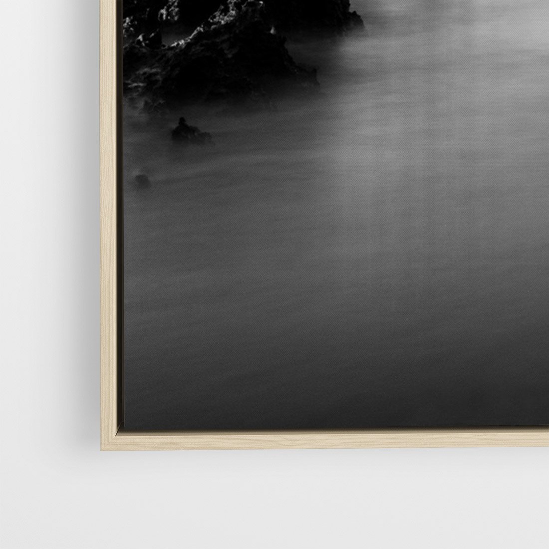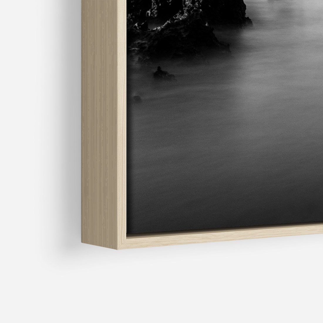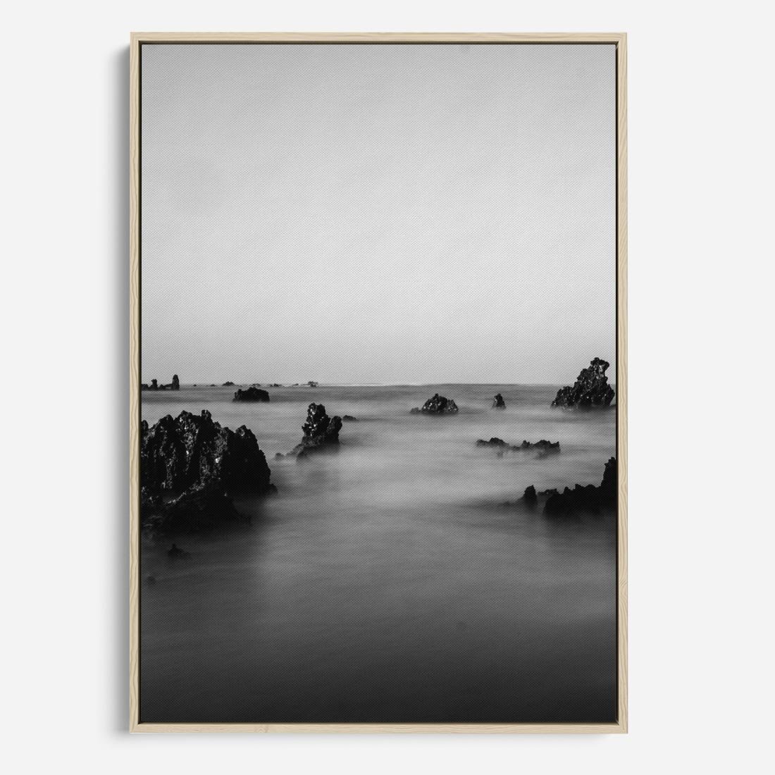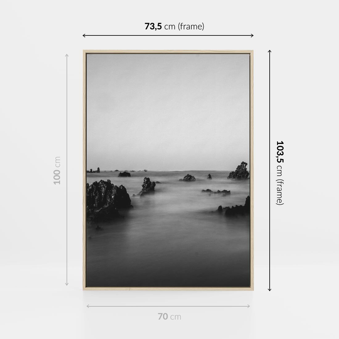 Obraz w ramie 70x100 - Harmonia świateł i cieni - zamglona dzika plaża, skały na plaży - rama drewno