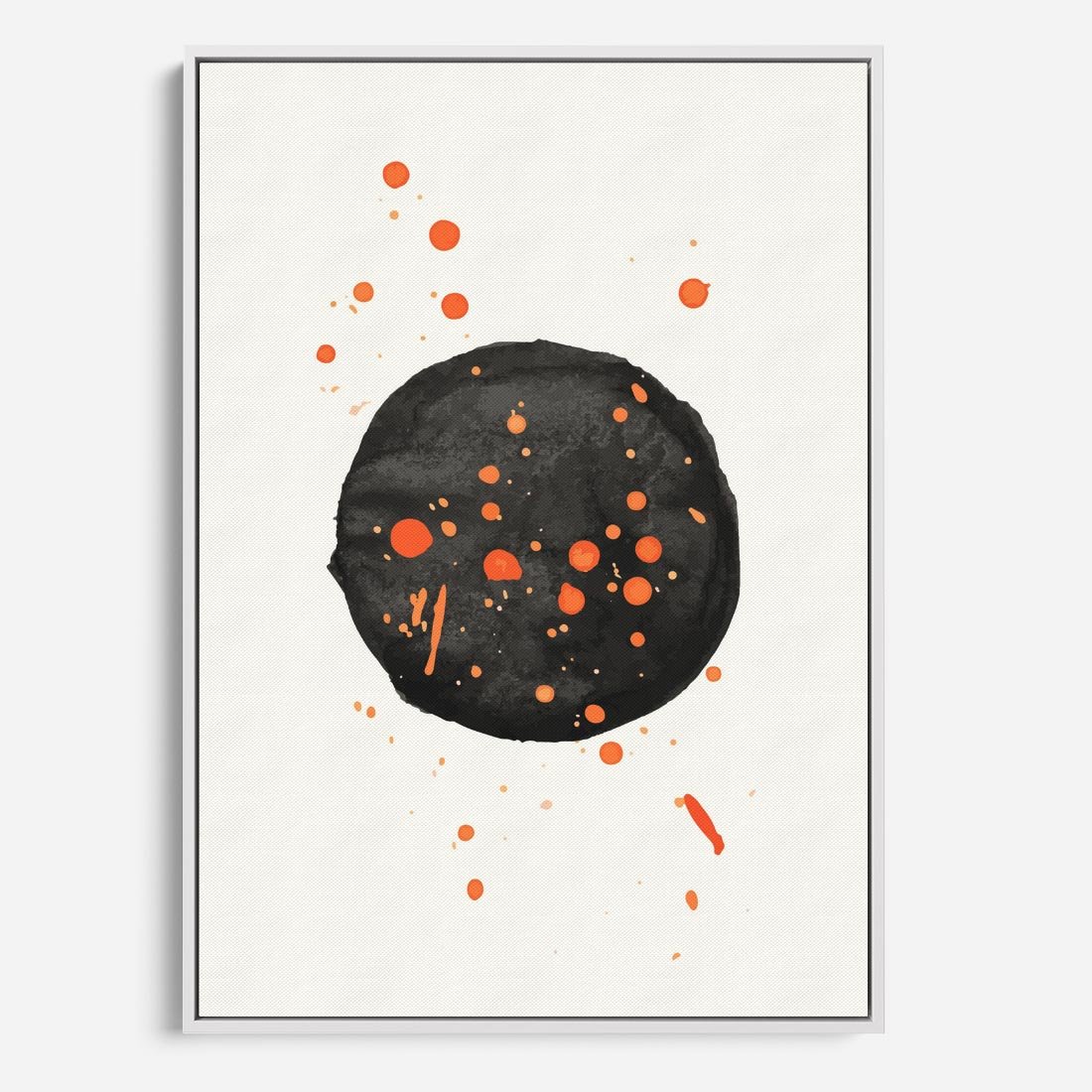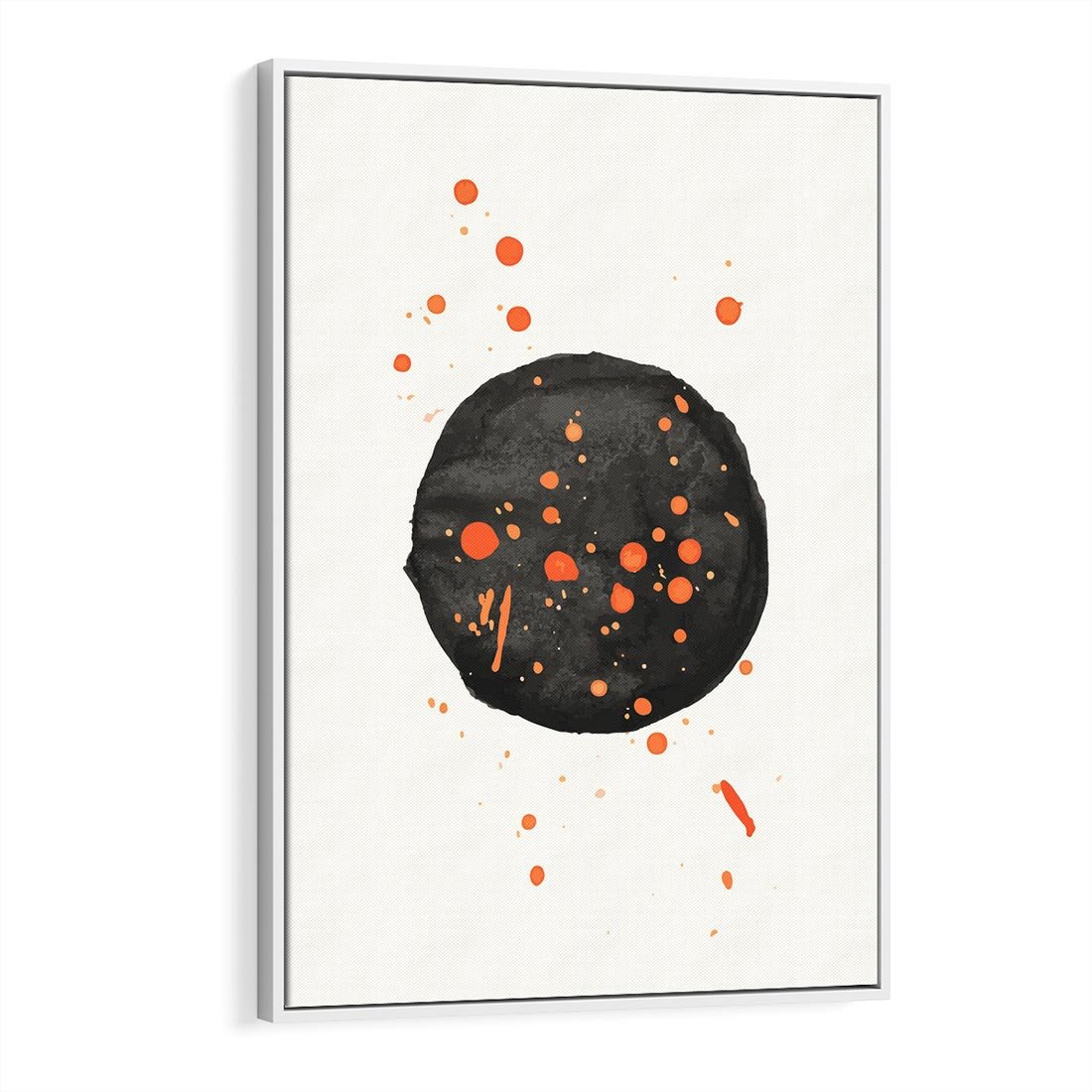 Obraz w ramie 70x100 - Impulsy Kreatywności - abstrakcyjna czarna plama, rozsiane pomarańczowe kropki - rama biała