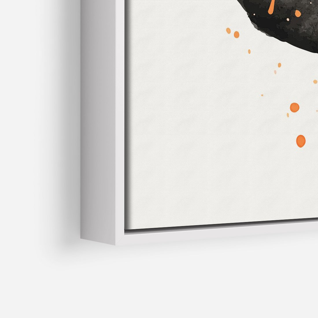 Elegancki obraz o wyrazistej abstrakcyjnej czarnej plamie, ozdobiony rozsianymi pomarańczowymi kropkami. Minimalistyczny styl wzbogacony mocnym akcentem. Sztuka nowoczesna w pełnej harmonii.