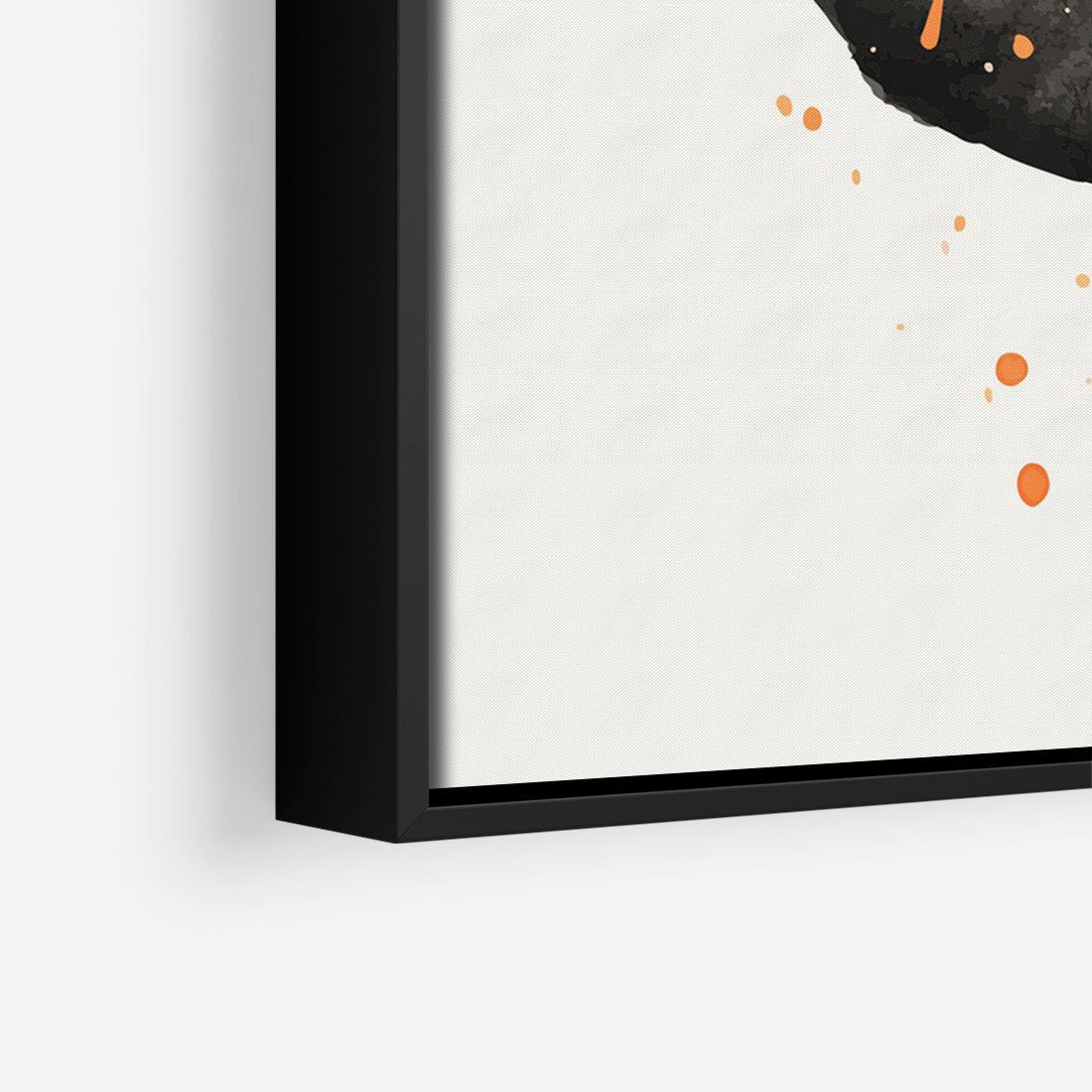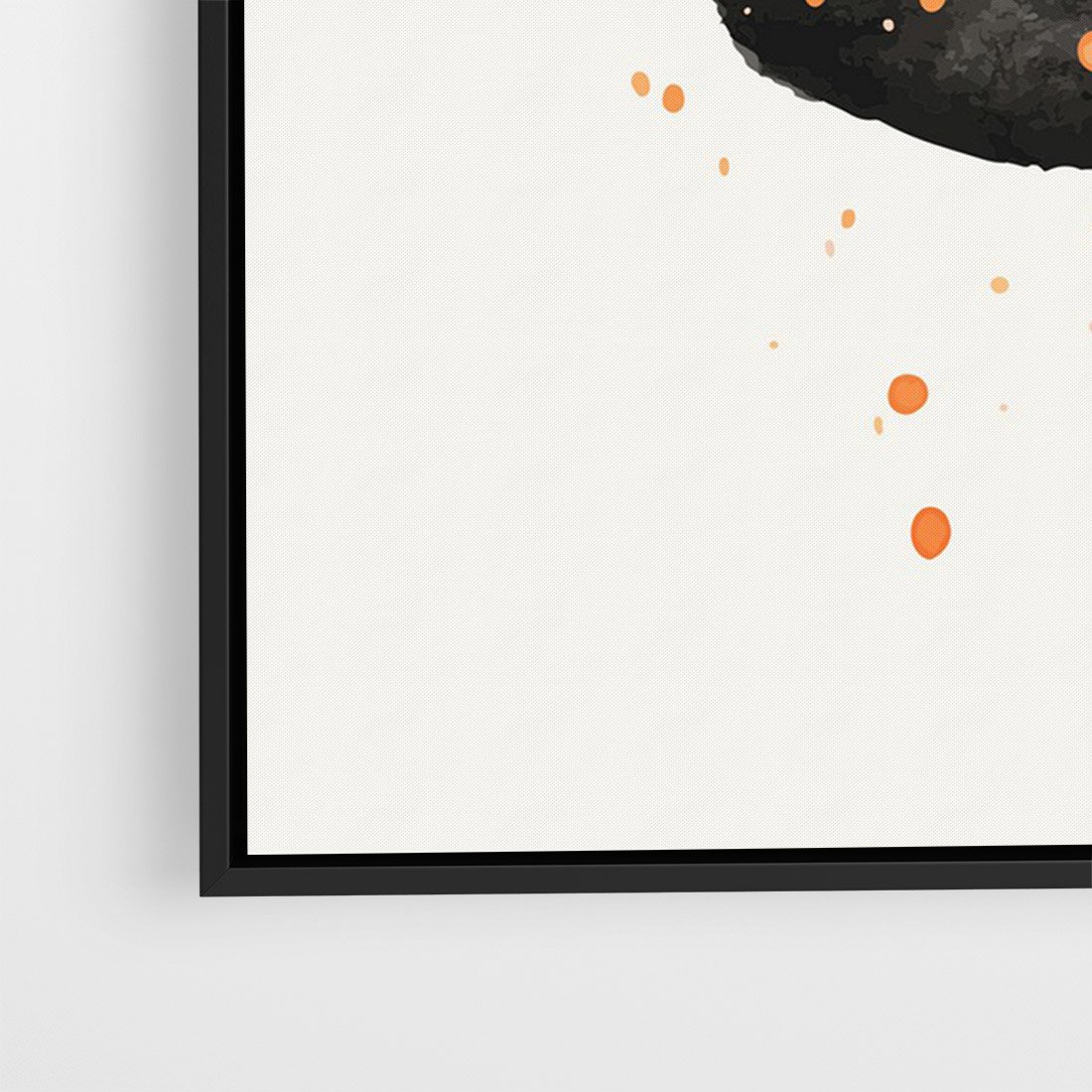 Elegancki obraz o wyrazistej abstrakcyjnej czarnej plamie, ozdobiony rozsianymi pomarańczowymi kropkami. Minimalistyczny styl wzbogacony mocnym akcentem. Sztuka nowoczesna w pełnej harmonii.