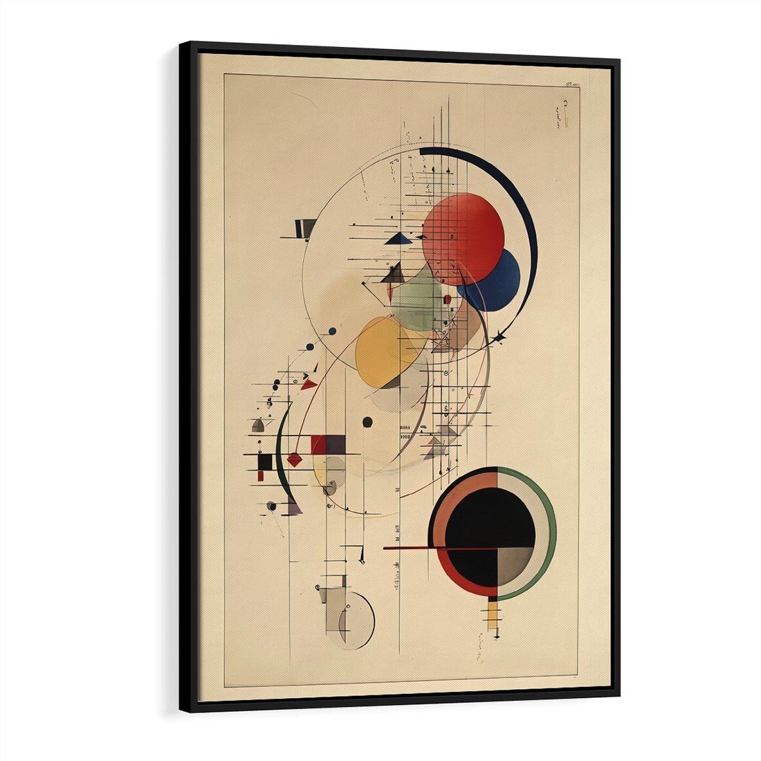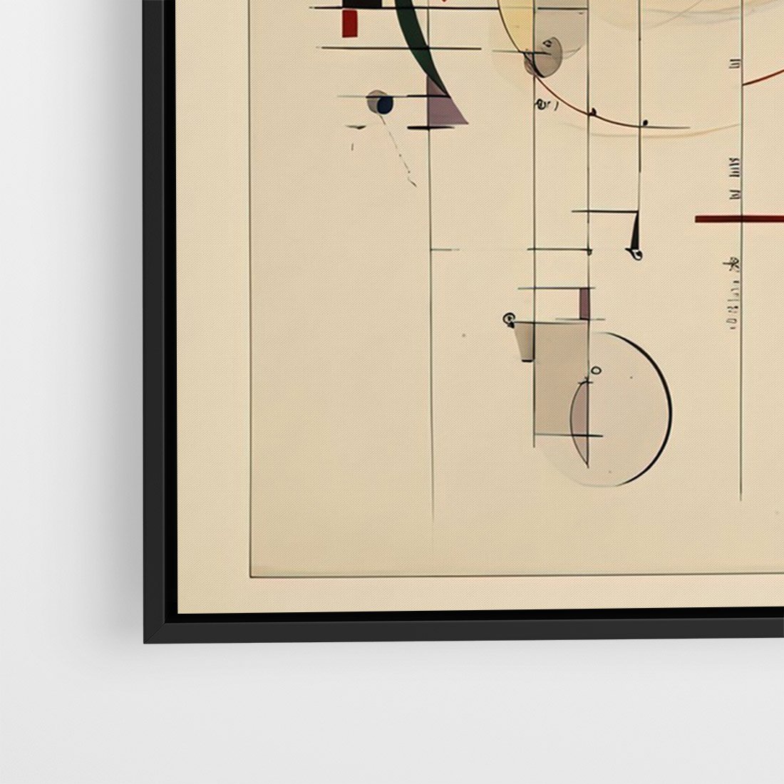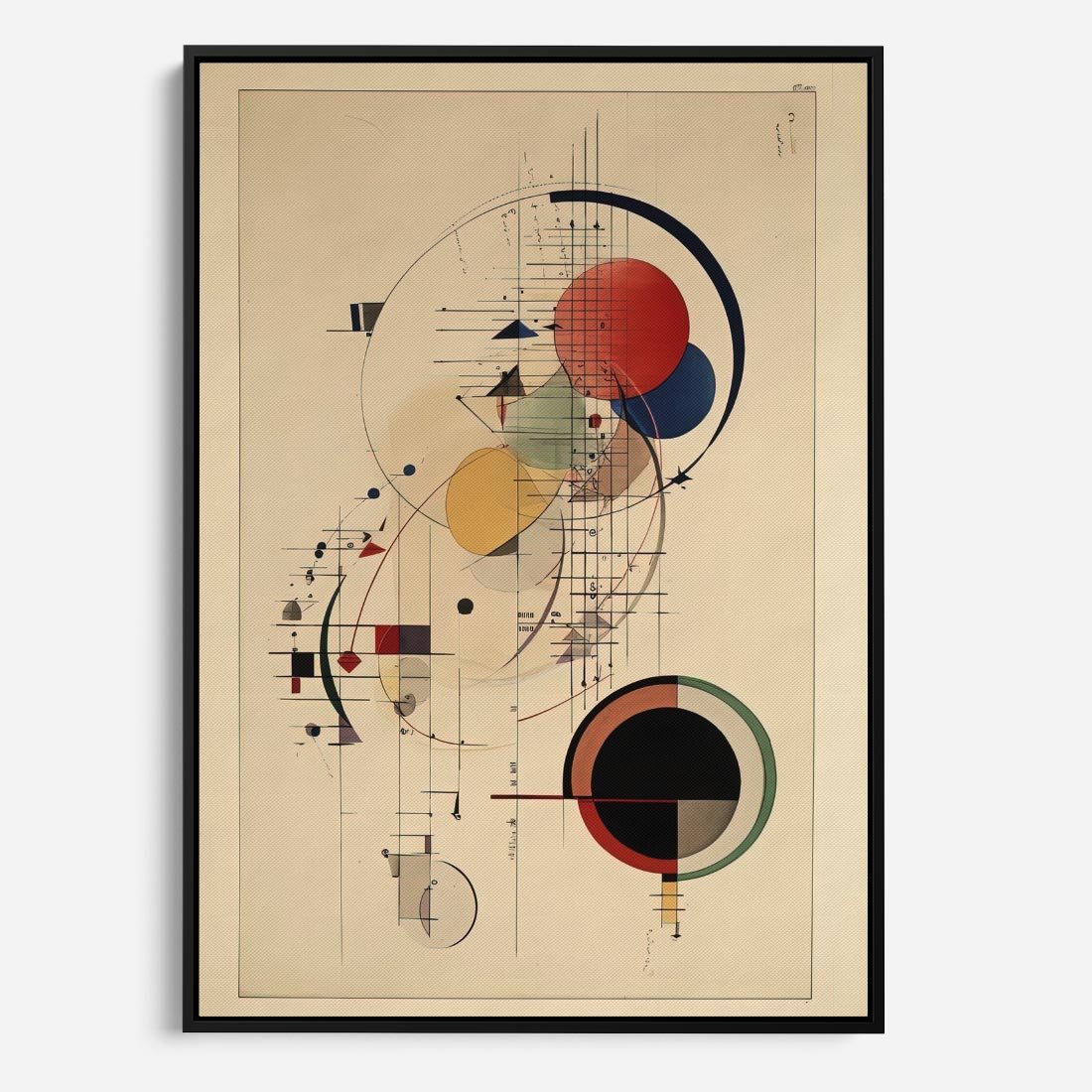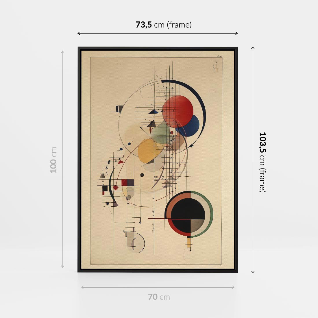 Ta abstrakcyjna geometryczna kompozycja, inspirowana stylem Wassily'ego Kandinsky'ego, używa kół i linii, aby tworzyć dynamiczną harmonię kształtów i kolorów. To wizualne doświadczenie przenosi widza w emocjonalną podróż przez abstrakcyjne światy.