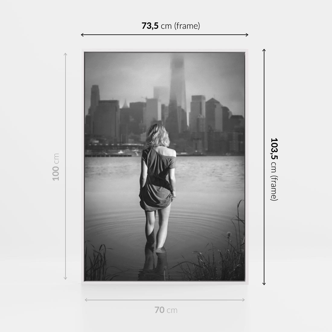 Obraz w ramie 70x100 - Kapiel w Mieście - czarno białe zdjęcie, kobieta wchodzi do wody - rama biała
