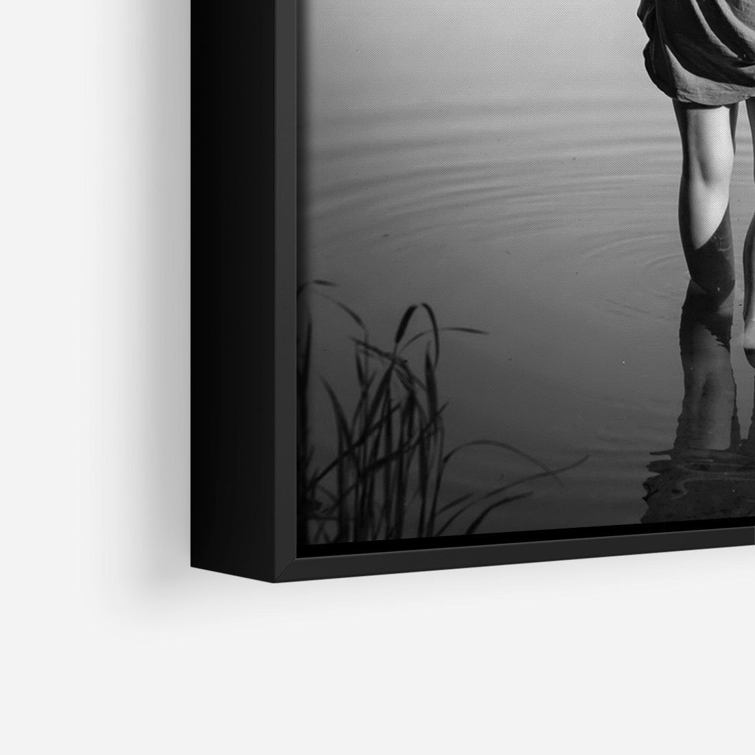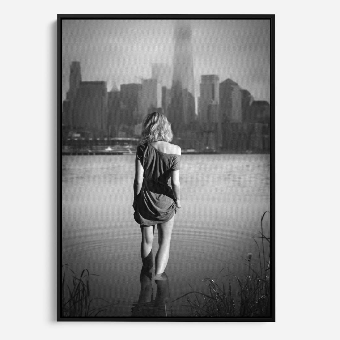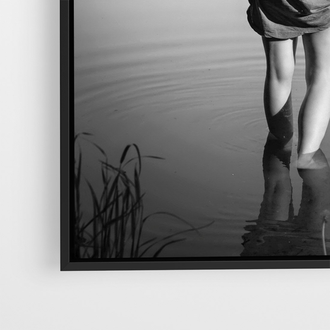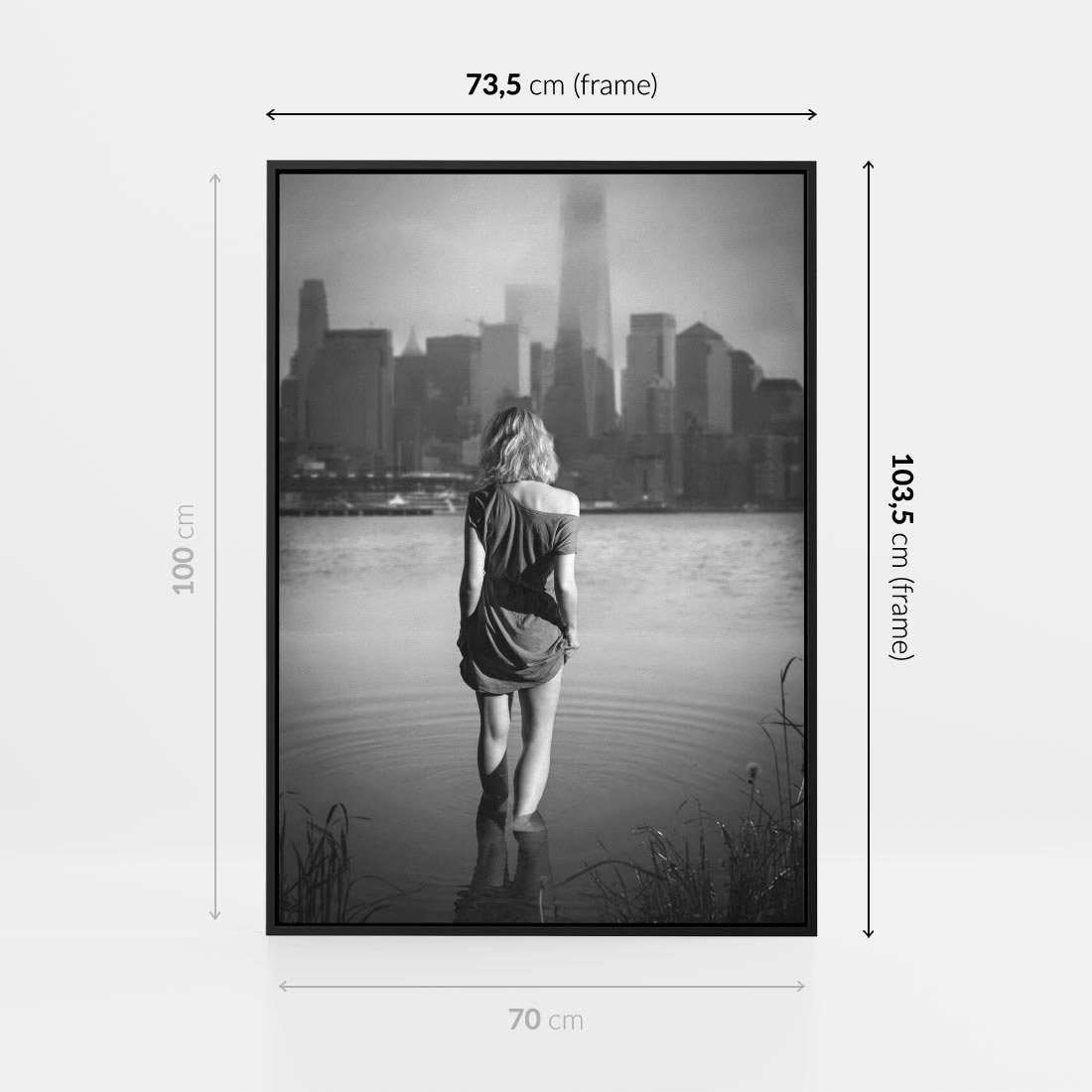 Obraz w ramie 70x100 - Kapiel w Mieście - czarno białe zdjęcie, kobieta wchodzi do wody - rama czarna