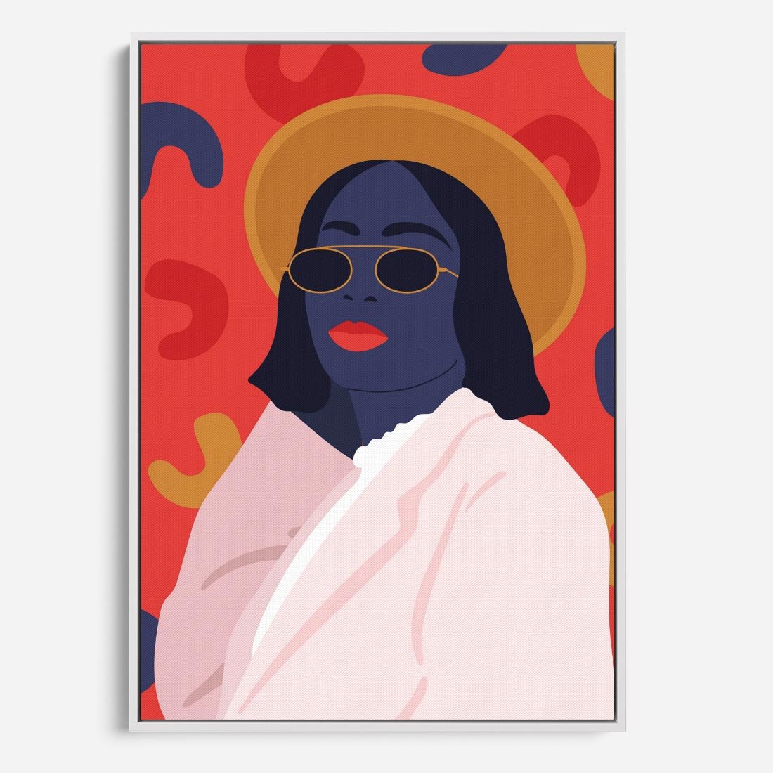Nowoczesny plakat w stylu retro przedstawia kobietę w okularach słonecznych. Żywe kolory podkreślają jej styl i wyjątkowość, tworząc dynamiczną kompozycję pełną energii i osobowości.