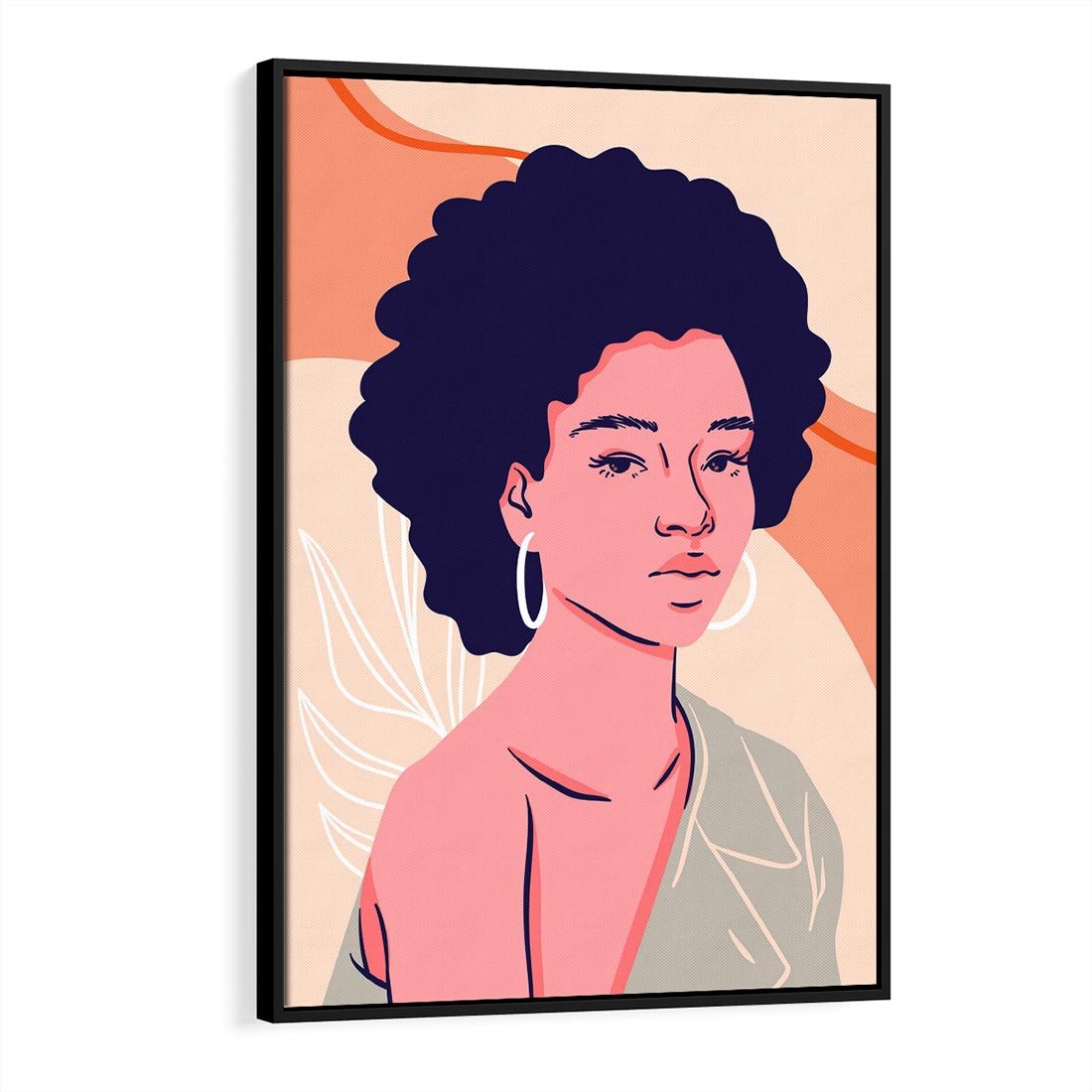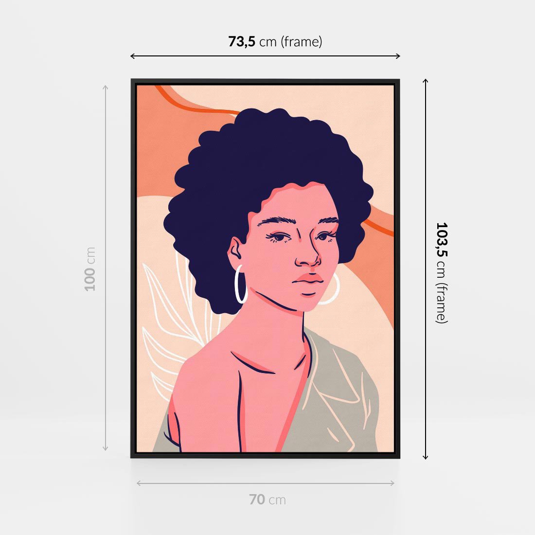 W stylowym plakacie o nowoczesnym wydźwięku retro widnieje portret kobiety w stonowanych kolorach. To połączenie klasycznego charakteru z nowoczesnością, tworzące wyrafinowaną i harmonijną kompozycję.