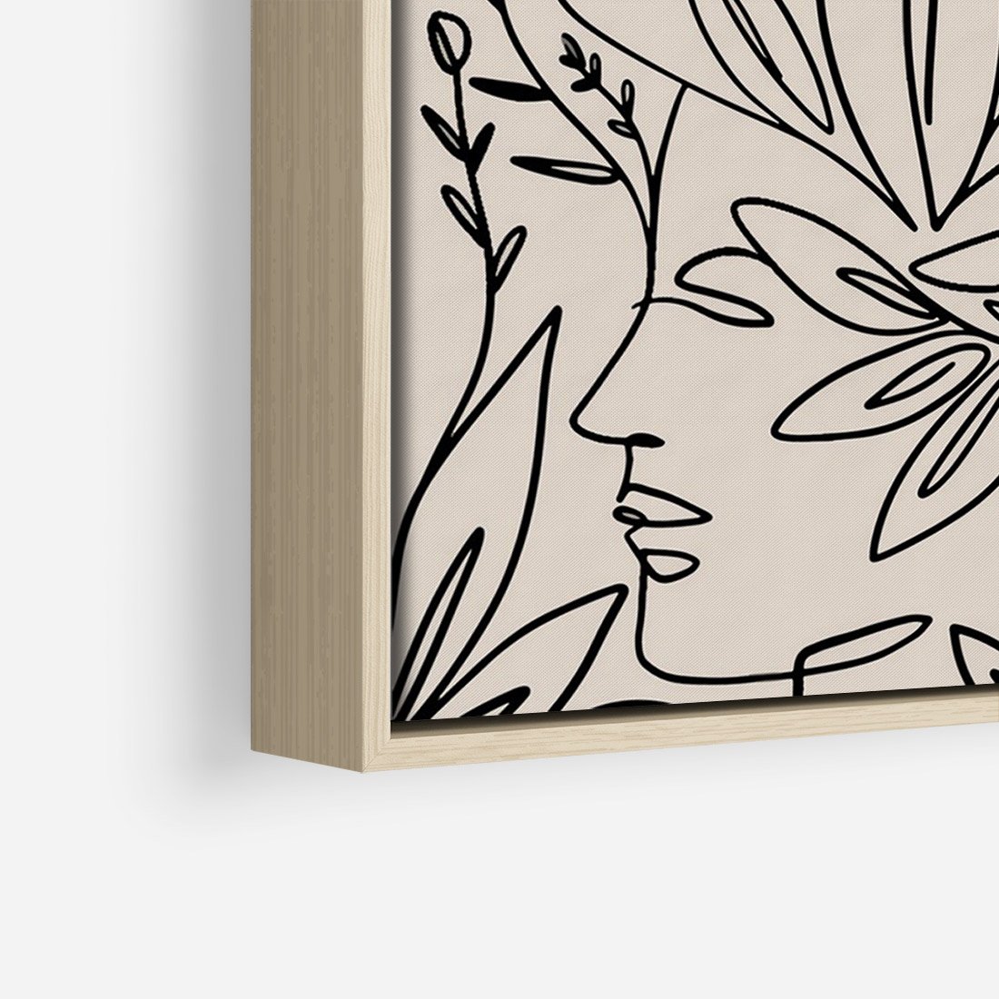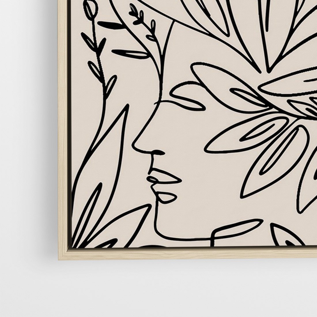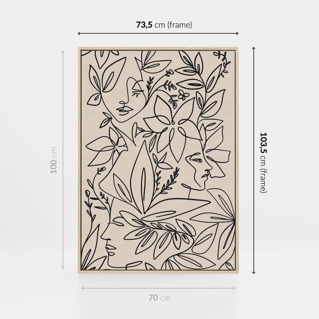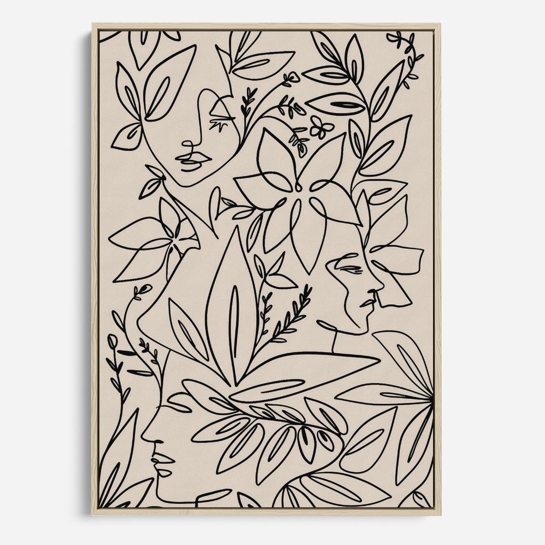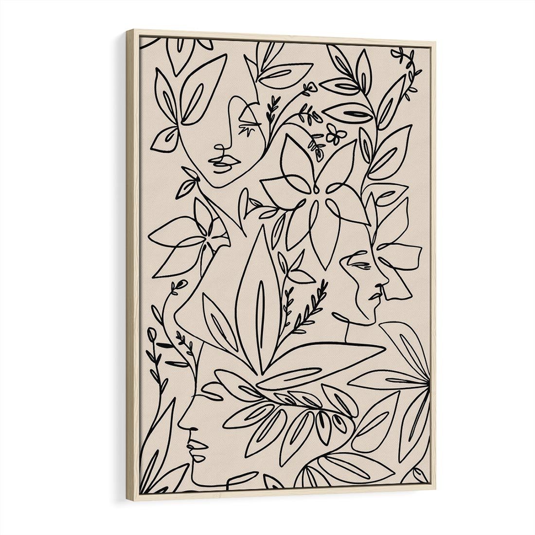 Obraz w ramie 70x100 - Kobiecy Portret Duszy - beżowe tło, czarny szkic nowoczesnych kwiatów - rama drewno