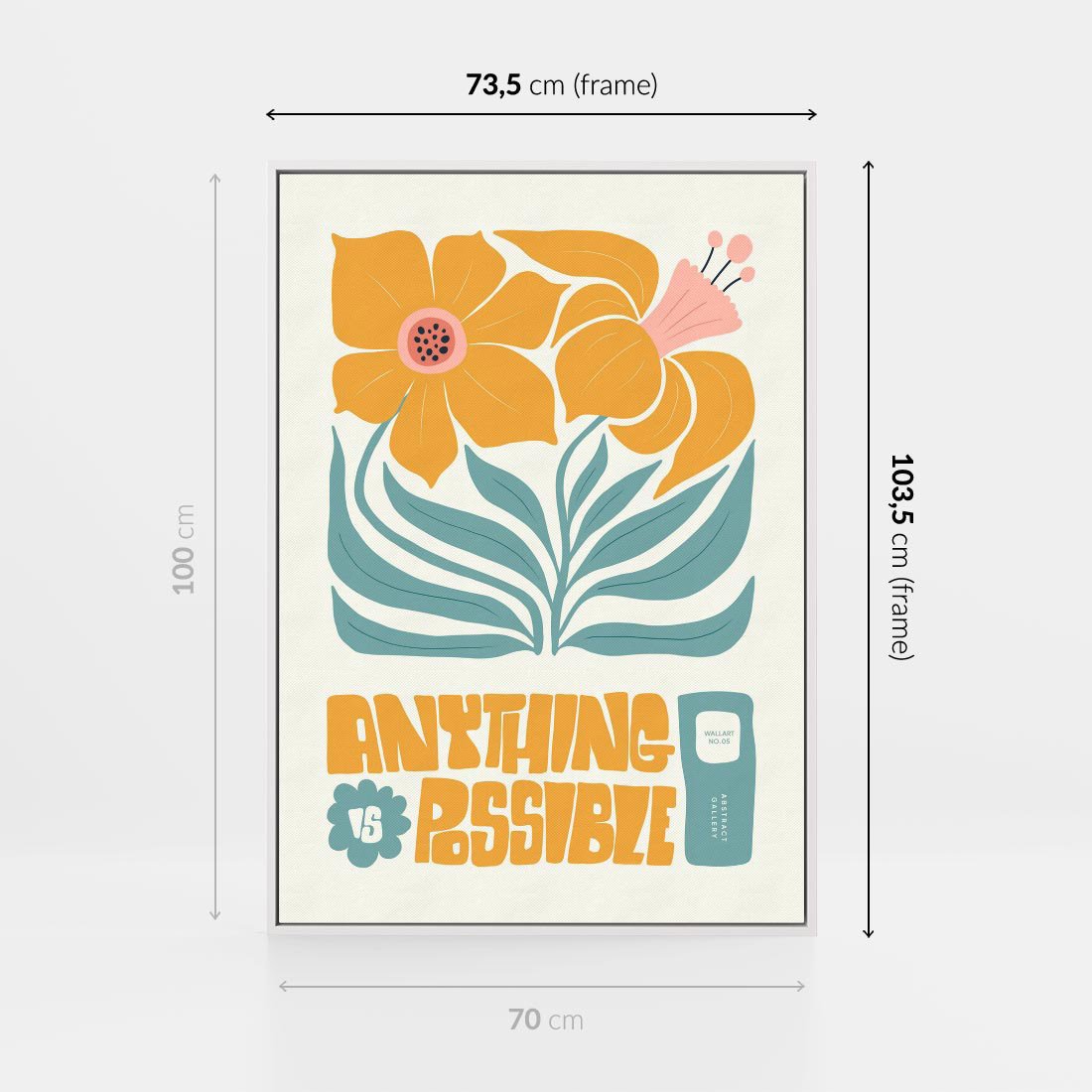 Ta nowoczesna sztuka przenosi nas w świat pastelowych marzeń, gdzie abstrakcyjne kwiaty tańczą z subtelnością. Wzbogacona wyrazistą typografią, tworzy kompozycję pełną piękna i wyobraźni.