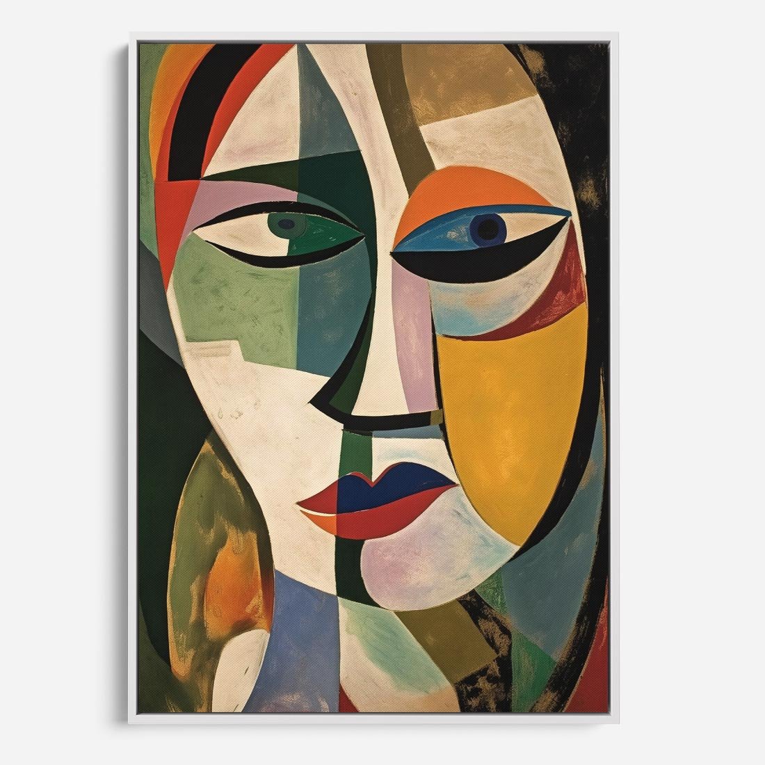Ten abstrakcyjny obraz olejny przedstawia twarz kobiety w stylu nawiązującym do Picassa. Żywe i ekspresyjne kolory tworzą dynamiczną kompozycję, ukazującą emocje i indywidualność. To unikalne dzieło sztuki wyróżni się w każdym wnętrzu.
