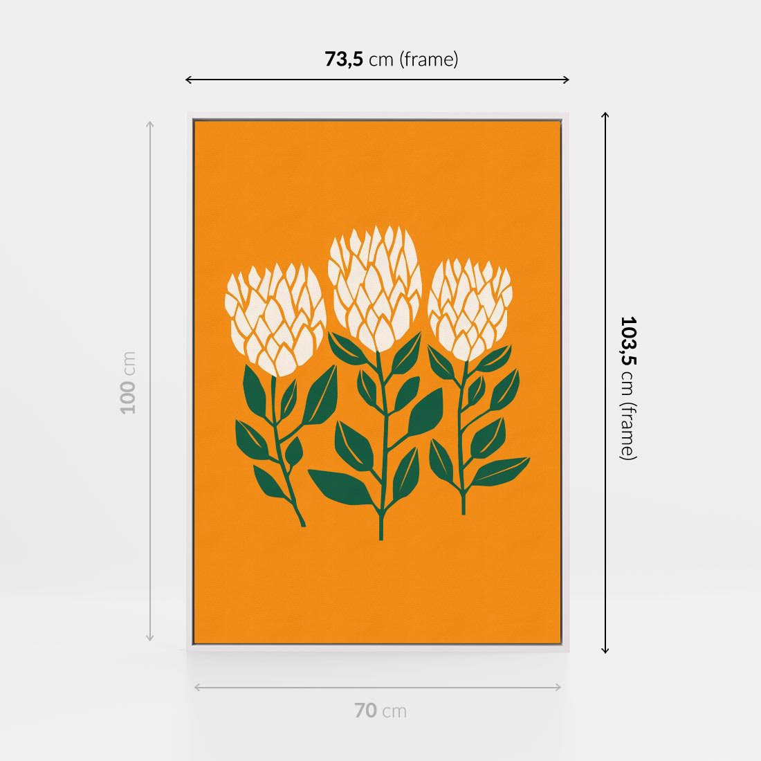 Ten nowoczesny plakat prezentuje abstrakcyjną kwiatową kompozycję na intensywnym, żółtym tle. Sztuka ta wprowadza optymizm i wibracje do Twojego salonu, tworząc pełne energii i wyrazistości otoczenie, które przyciąga uwagę i dodaje charakteru przestrzeni.