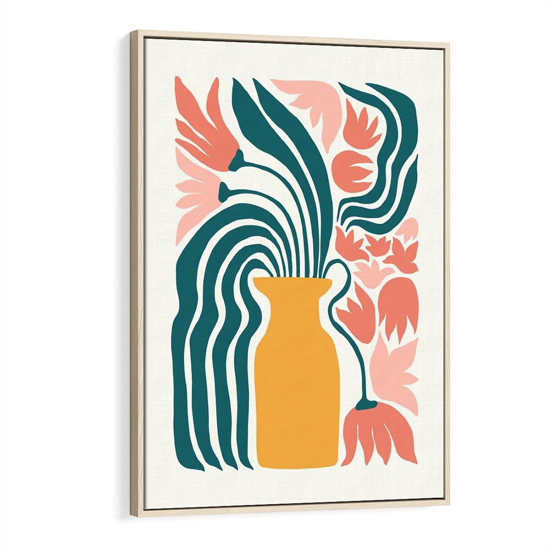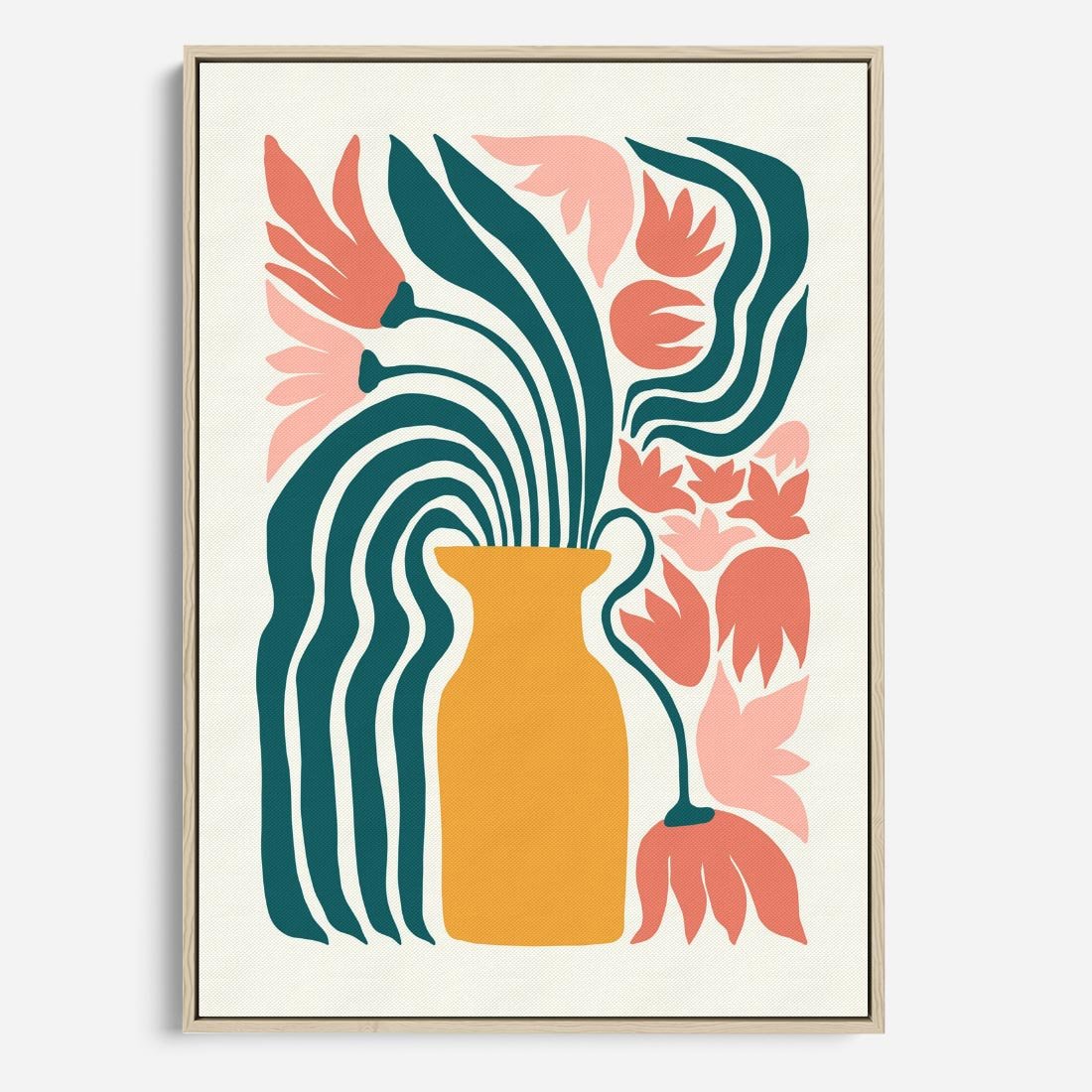 Ten nowoczesny plakat ukazuje abstrakcyjne kwiaty w delikatnych pastelowych odcieniach, tworząc wyjątkową kompozycję w wazonie. Sztuka ta emanuje spokojem i estetyką, zachęcając do odkrywania piękna w prostocie.