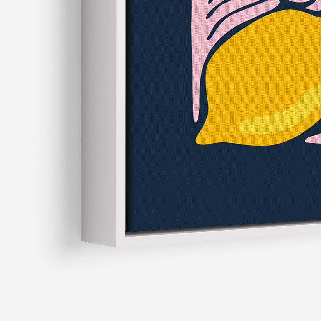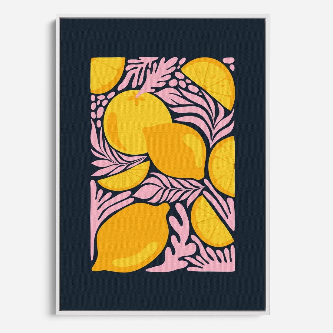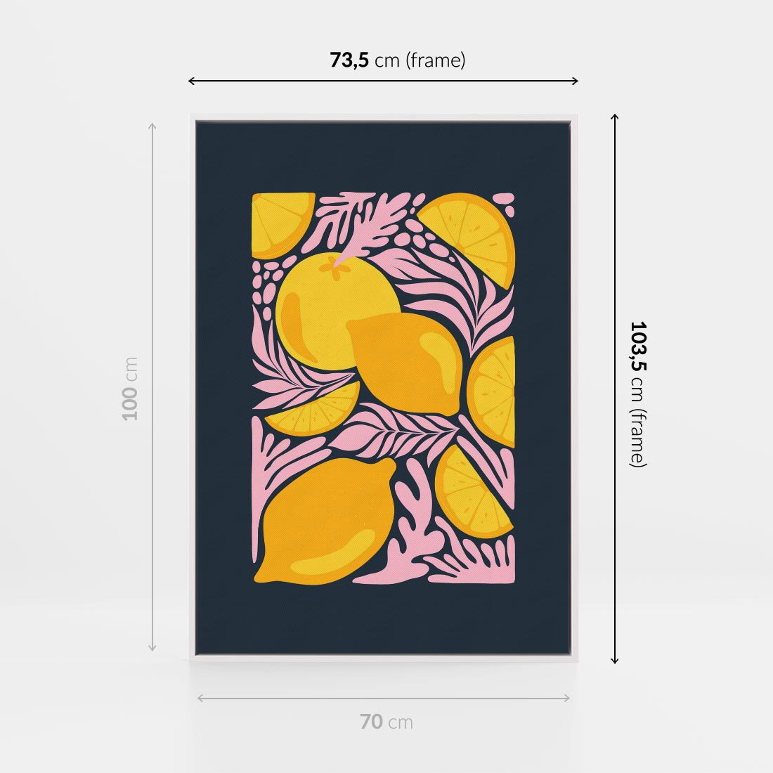 Ta nowoczesna kompozycja zestawia soczyste cytryny i liście na eleganckim granatowym tle. Sztuka ta wprowadza energetyczną świeżość i harmonię natury do przestrzeni, tworząc dynamiczną i stylową wizję.