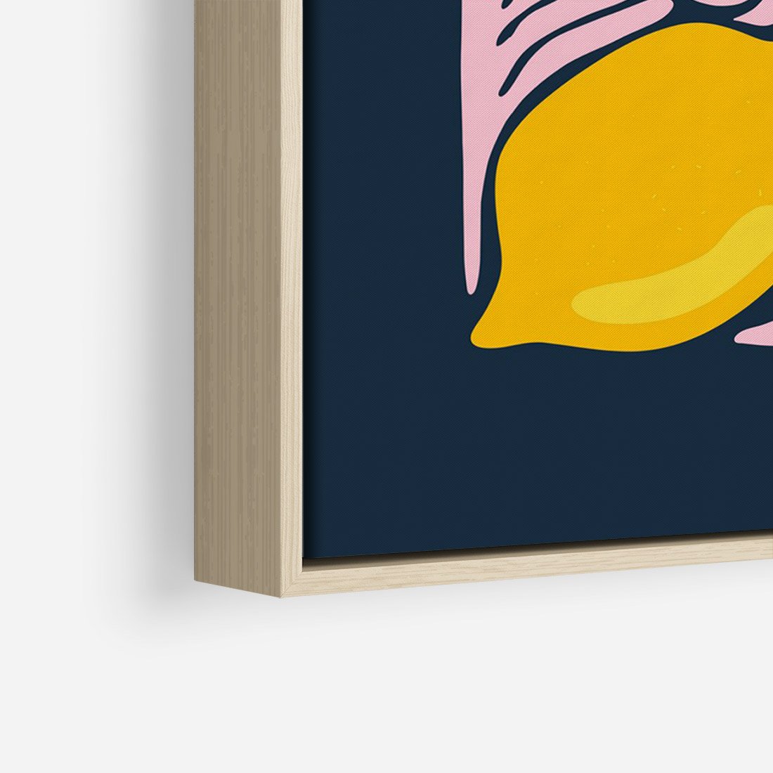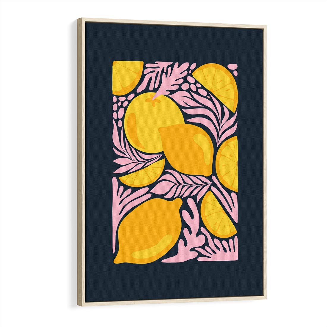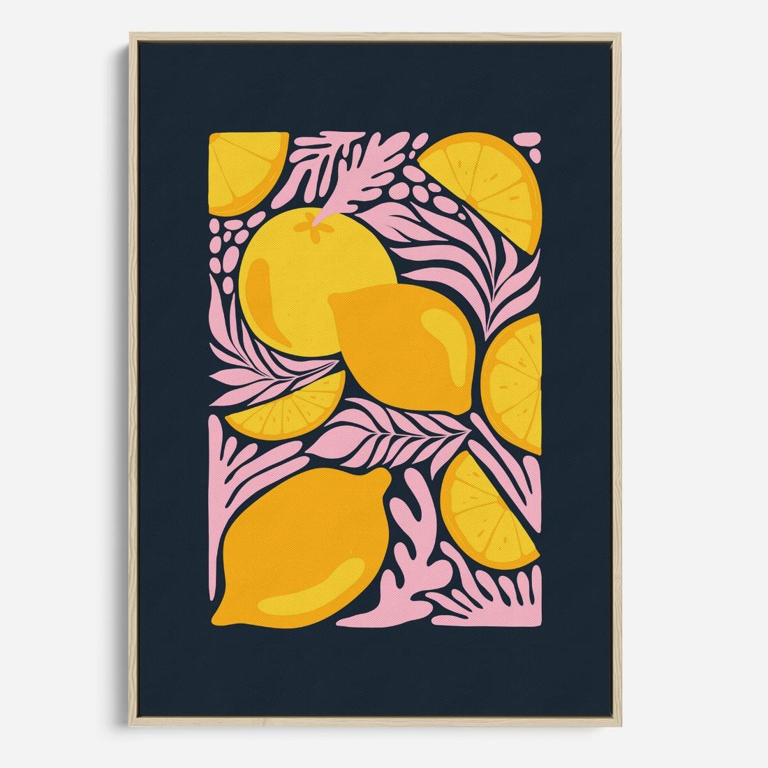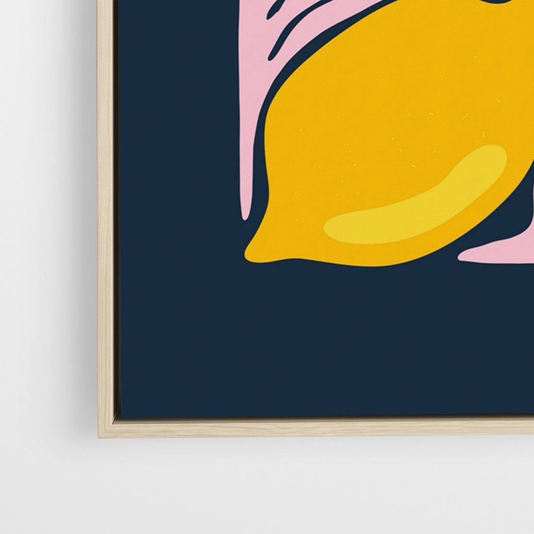 Ta nowoczesna kompozycja zestawia soczyste cytryny i liście na eleganckim granatowym tle. Sztuka ta wprowadza energetyczną świeżość i harmonię natury do przestrzeni, tworząc dynamiczną i stylową wizję.
