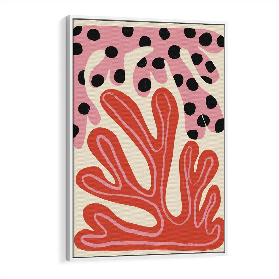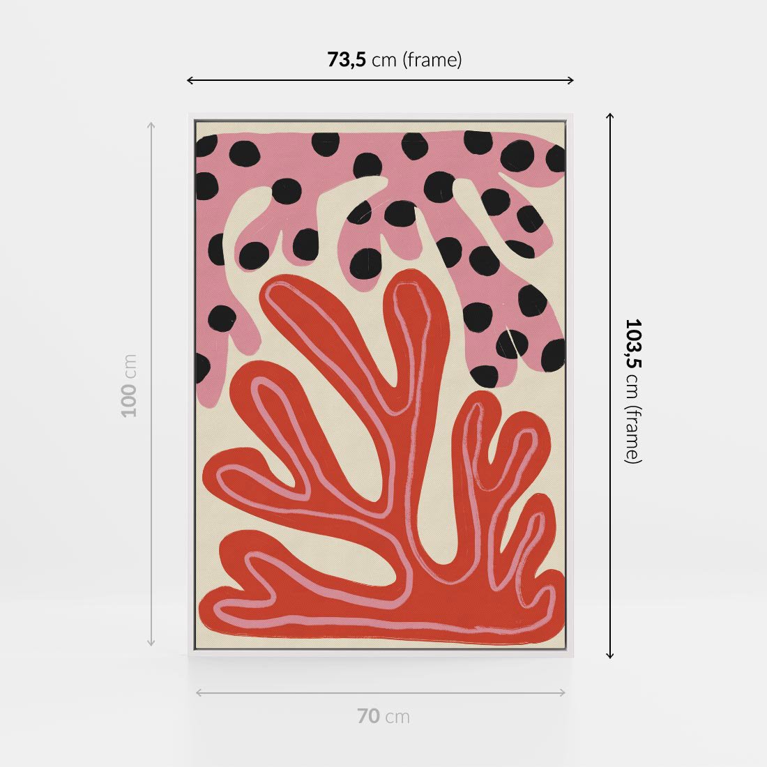 Ten abstrakcyjny obraz w formie plakatu fascynuje dziwnymi kształtami, które tworzą harmonię w odcieniach różowego i czerwonego. Jego wyjątkowość polega na zdolności zachęcania do refleksji, pobudzając wyobraźnię widza poprzez niekonwencjonalne kompozycje i intensywne barwy.