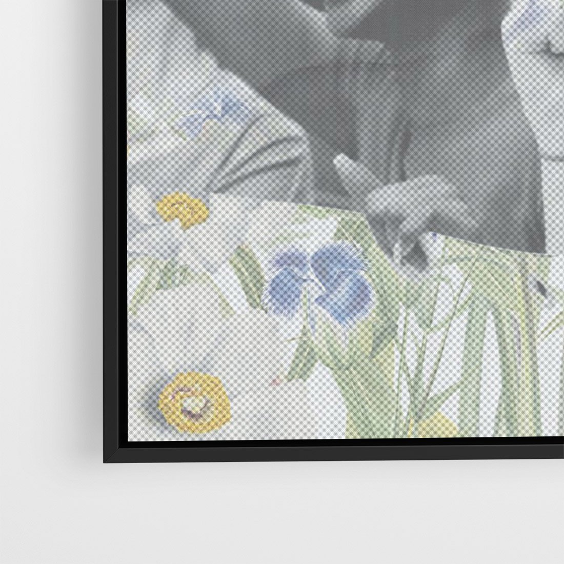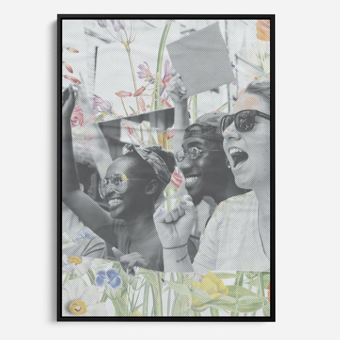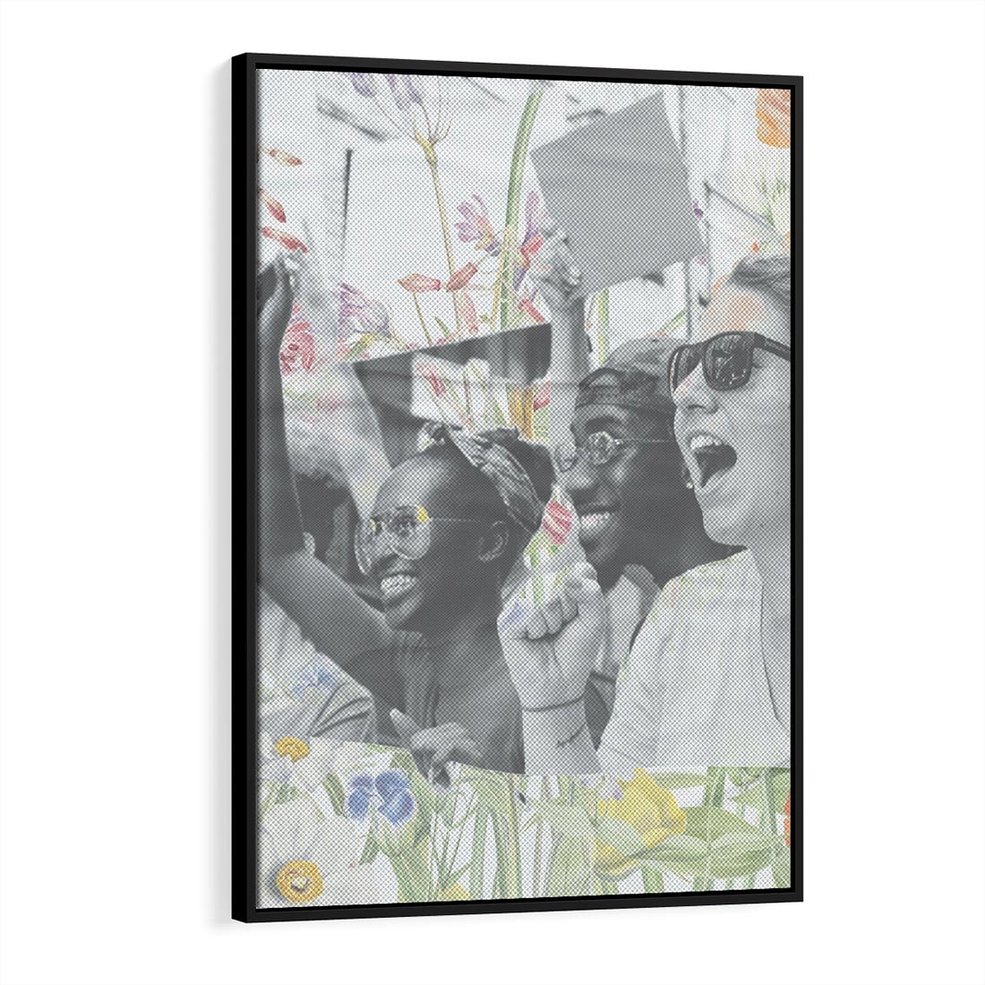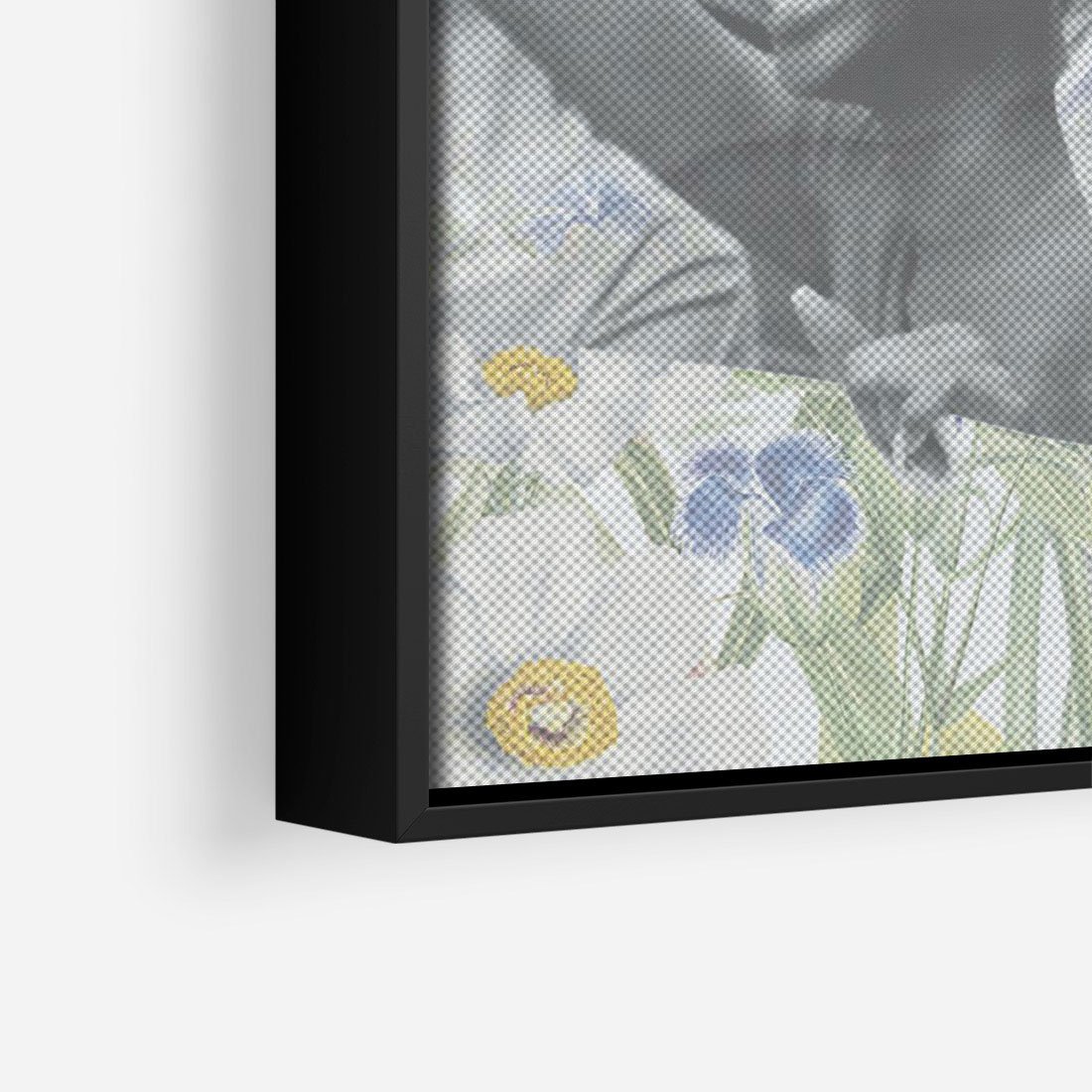 Zapraszamy do odkrycia tego wyjątkowego kolażu, który ukazuje czarno-białe zdjęcie wesołych młodych ludzi, otoczonych tłem z kwiatów retro. Doskonały akcent dla tych, którzy pragną wprowadzić do swoich wnętrz unikalny i radosny wyraz.