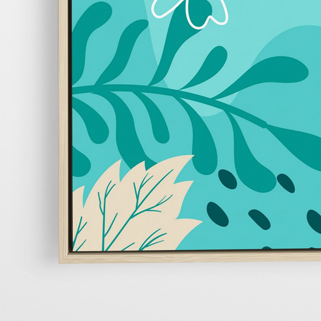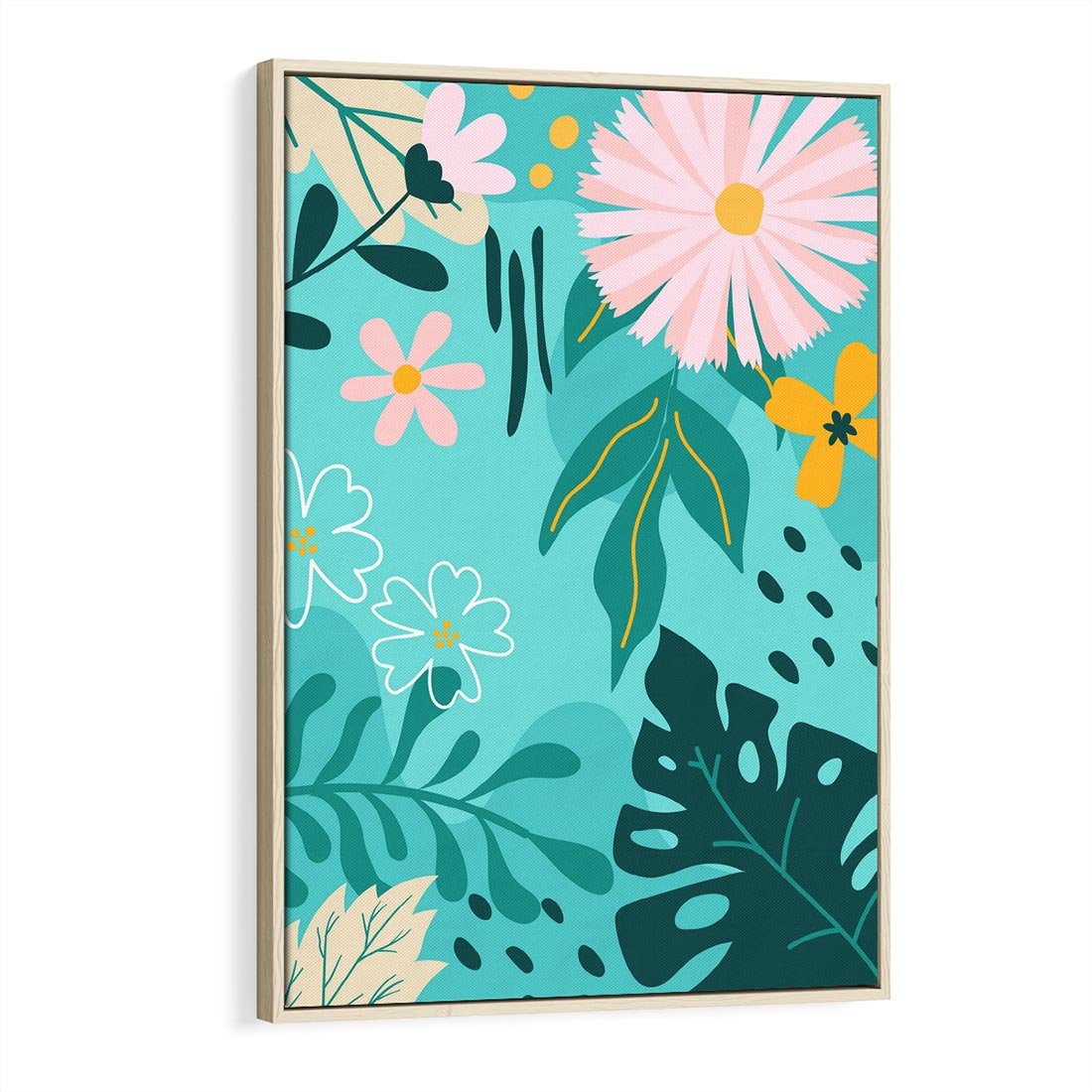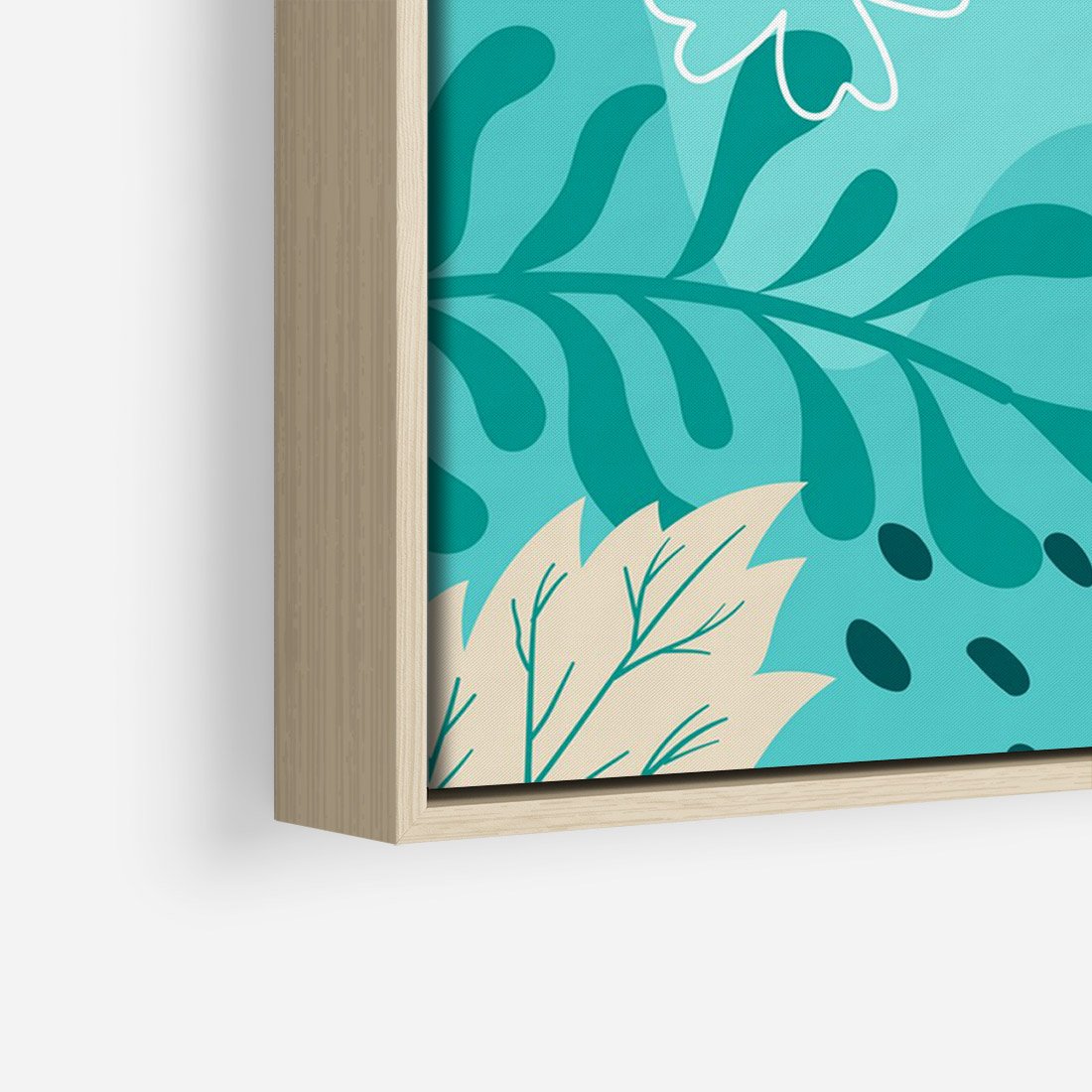 Pastelowa kompozycja z tropikalnymi liśćmi i kwiatami w odcieniach turkusu i różu. To wizualna podróż do tropikalnego raju, dodająca subtelności i koloru Twojej przestrzeni.