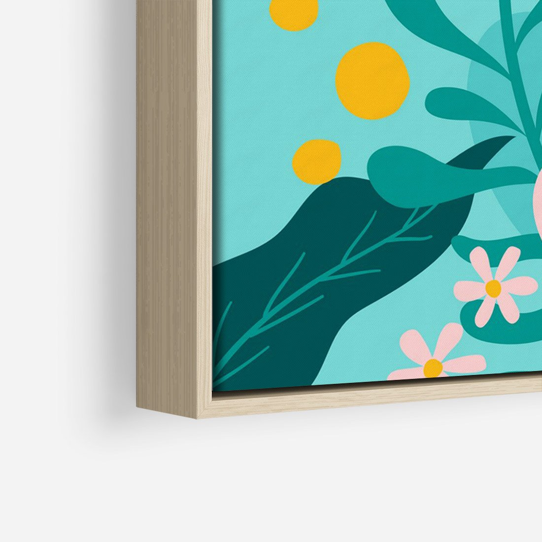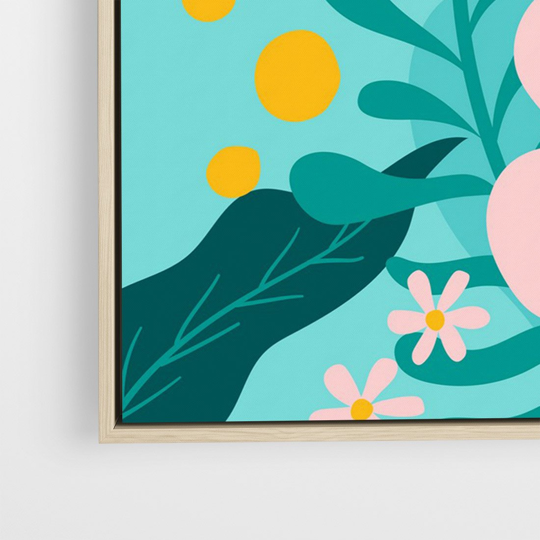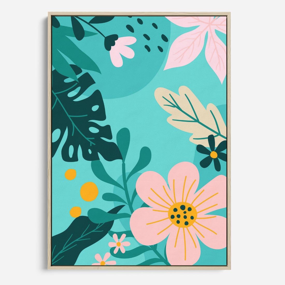 Pastelowa kompozycja wzbogacona kwiatami i tropikalnymi liśćmi w odcieniach turkusu i różu. To artystyczne połączenie natury i delikatności, tworzące harmonijną atmosferę.
