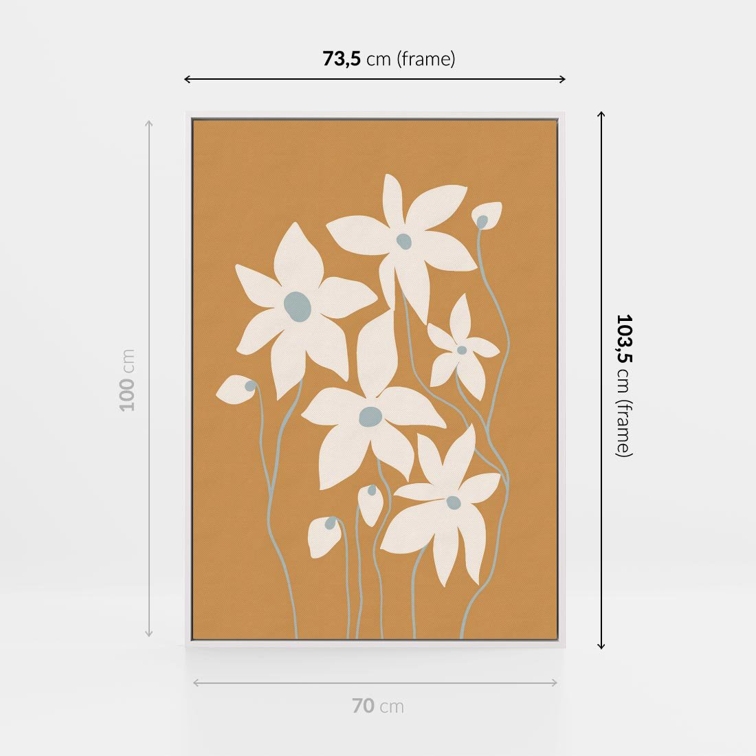 Obraz w ramie 70x100 - Kwiatowy Spektakl - minimalistyczne kwiaty, na pomarańczowym tle - rama biała