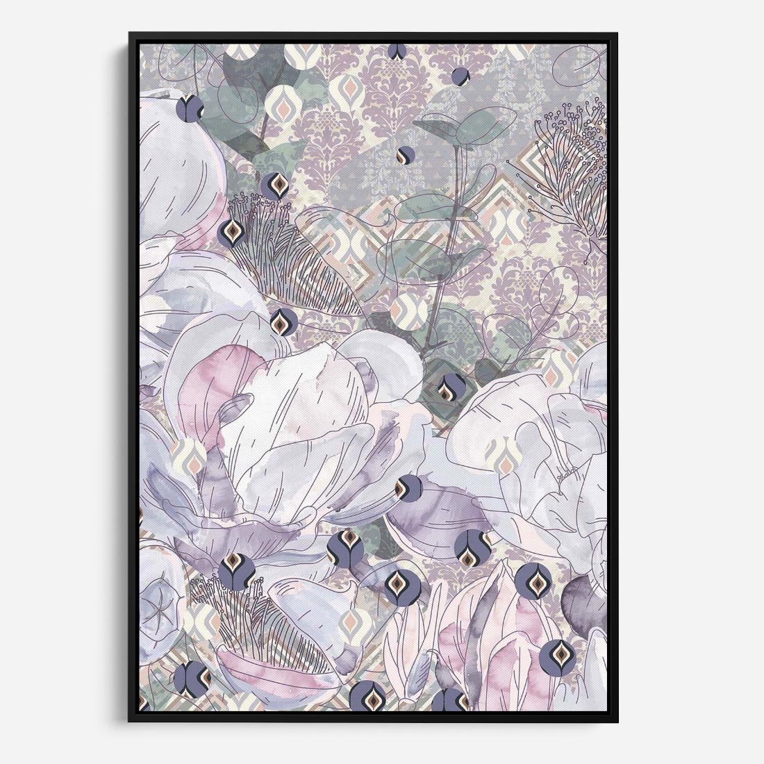 Obraz w ramie 70x100 - Malowane oddechy istnienia - pomieszane tekstury, kwiatowe elementy - rama czarna