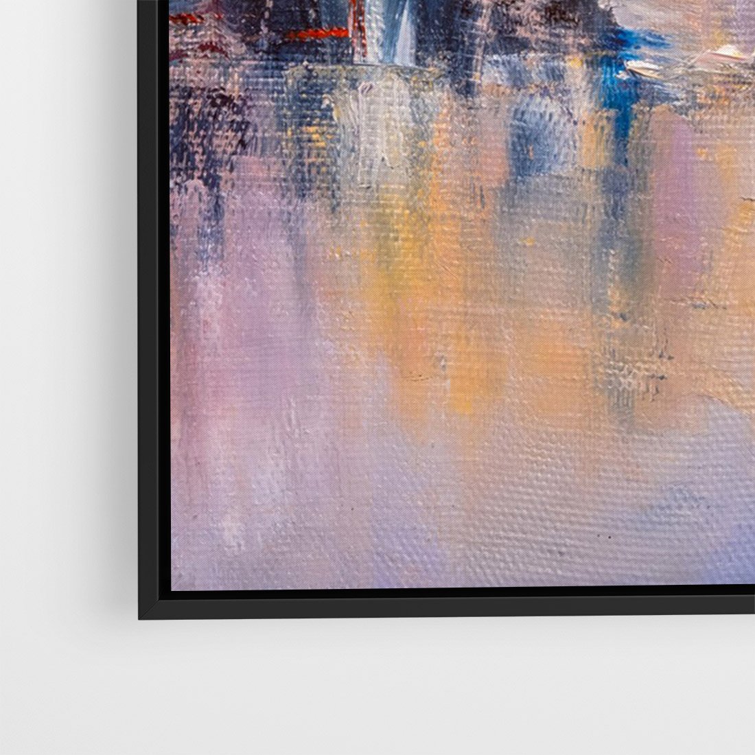 Obraz w ramie 70x100 - Miasto Refleksji - olejna panorama miasta w oddali, wiezowce odbijają się w rzece - rama czarna