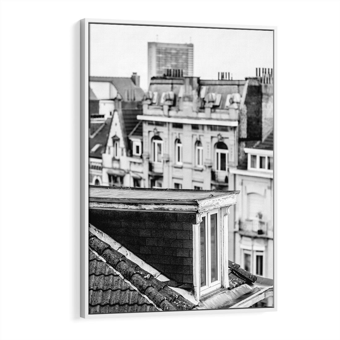 Obraz w ramie 70x100 - Miasto w Retro Odsłonie - fotografia czarno biała, ujęcie na dachy wielkiego miasta - rama biała