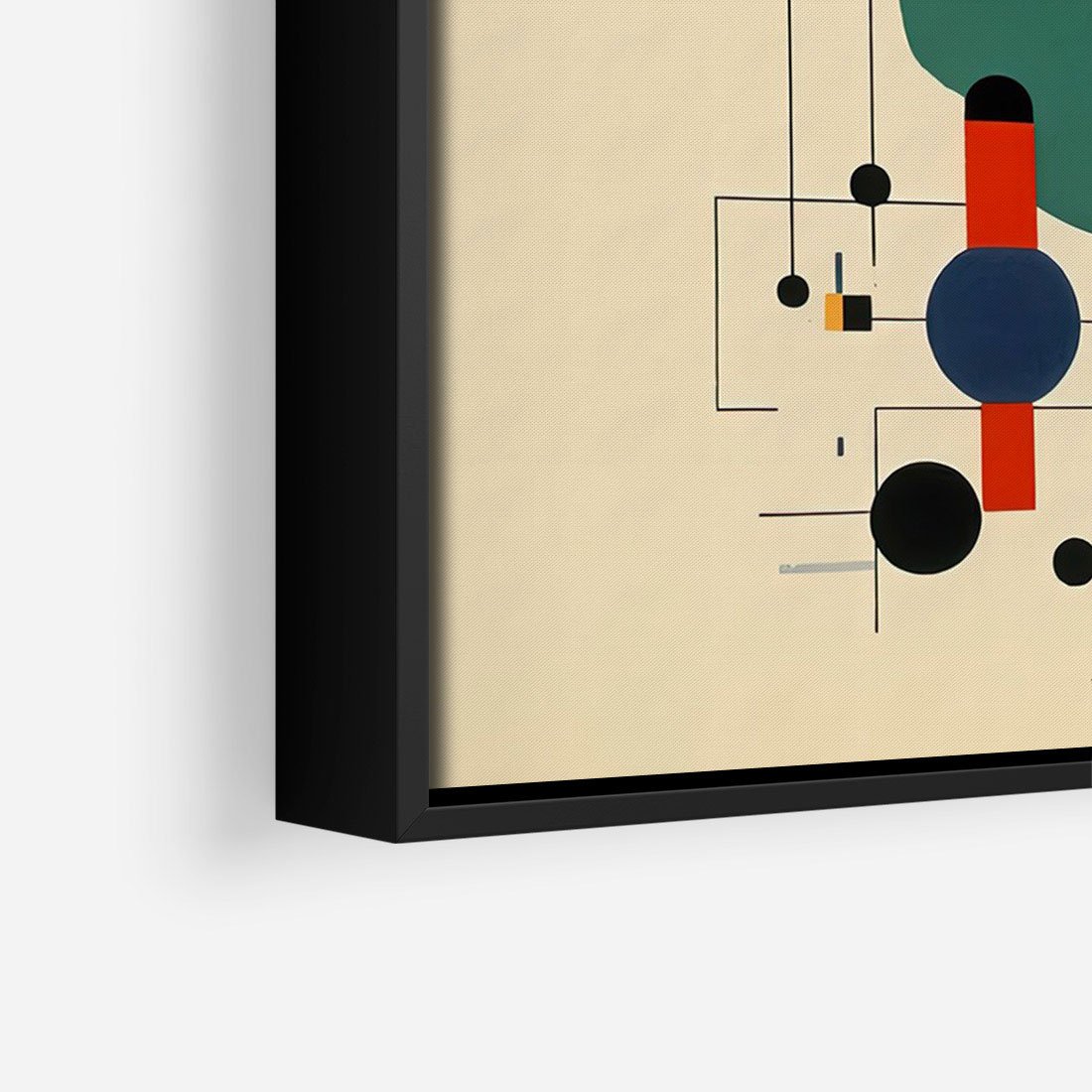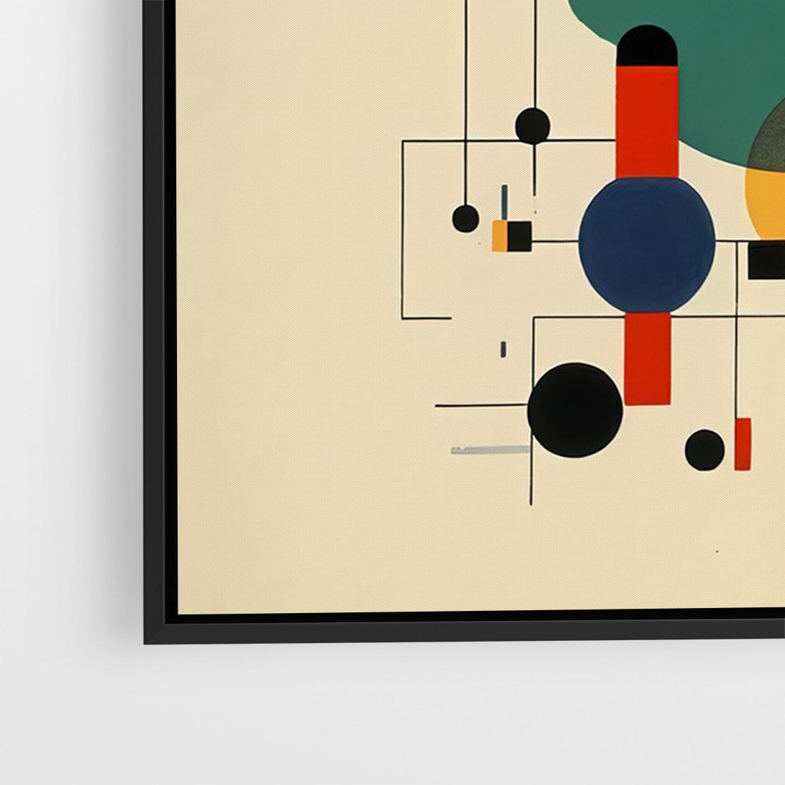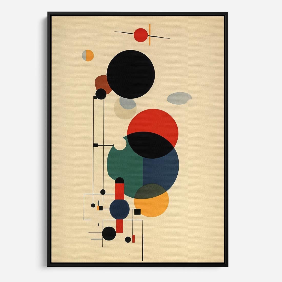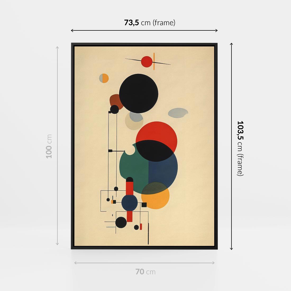 Ta abstrakcyjna geometryczna kompozycja inspirowana stylem Kandinsky'ego łączy w sobie elementy kół i linii, tworząc dynamiczną i ekspresyjną wizję. Ten wpływ dodaje głębi i emocji temu obrazowi.