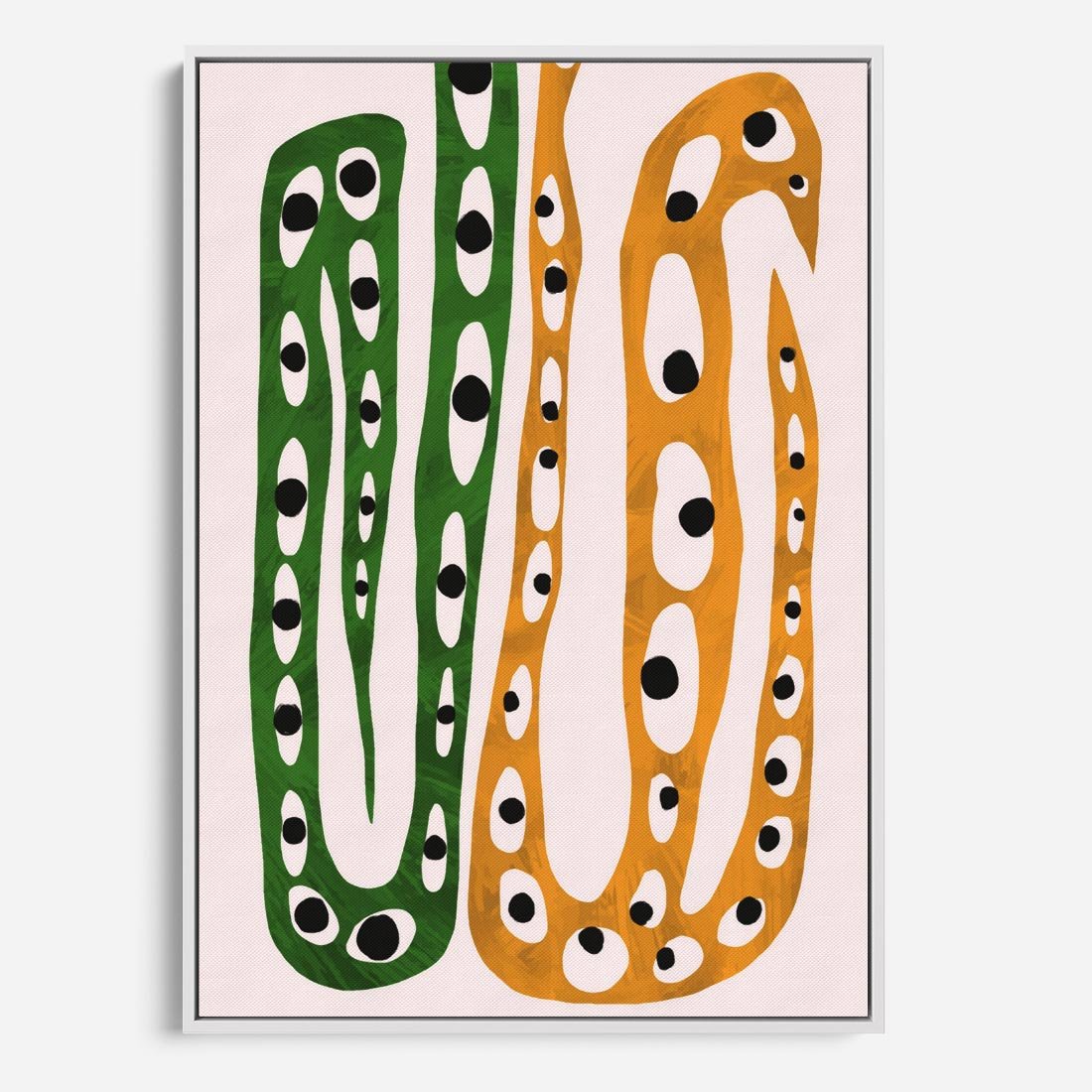 Nasz abstrakcyjny obraz przeniesie Cię w tajemniczy świat dziwnych kształtów przypominających zwinne węże. Soczyste żółte i zielone barwy ożywiają kompozycję, tworząc dynamiczny kontrast. To wyjątkowy akcent artystyczny, który dodaje charakteru i zaskoczenia każdej przestrzeni.