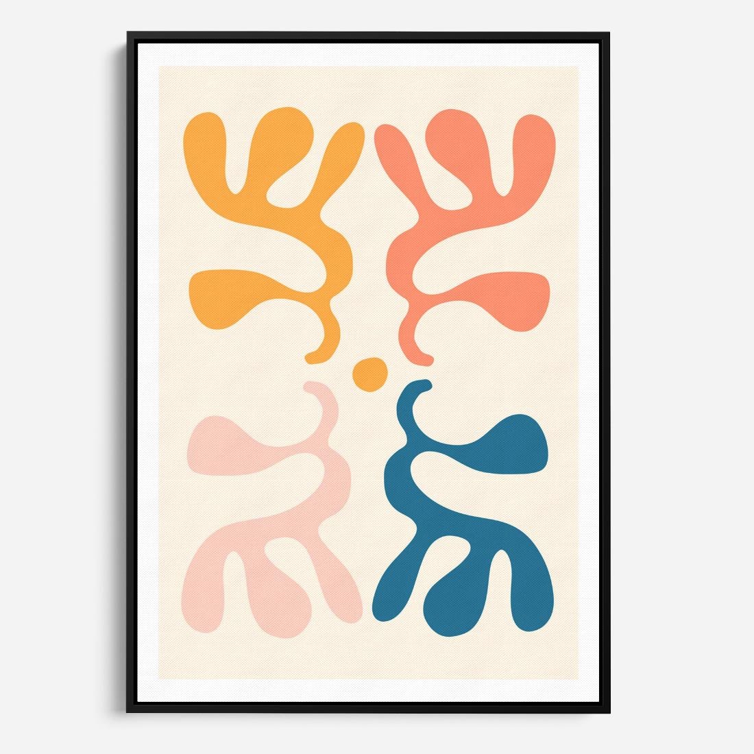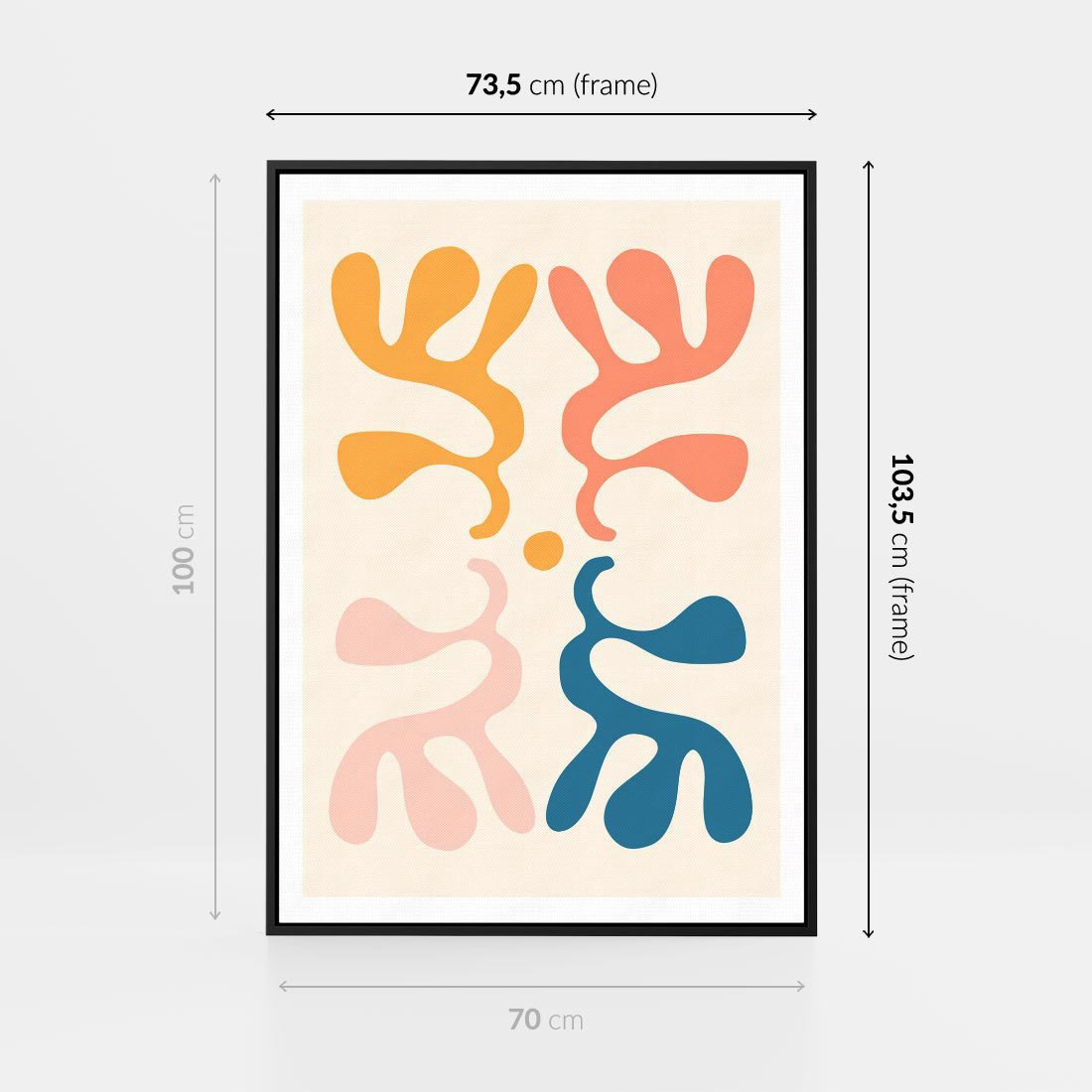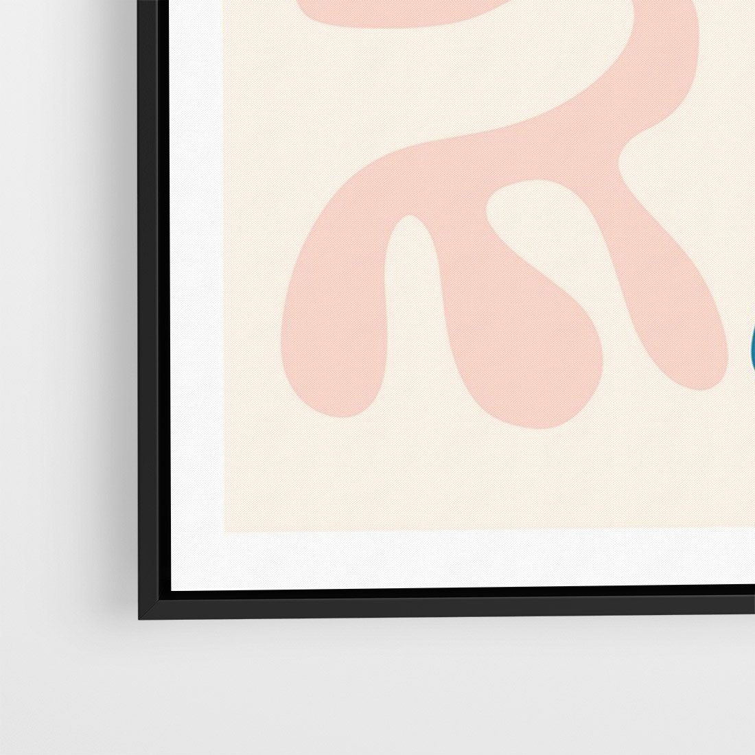 Ten nowoczesny plakat przedstawia abstrakcyjne, dziwne formy w delikatnych pastelowych kolorach. Kompozycja tworzy interesujący kontrast między nowoczesnym stylem a subtelnością kolorów, dodając unikalnego charakteru do przestrzeni.