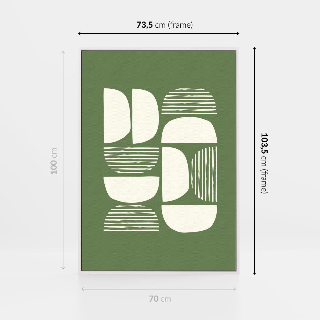 Ten plakat łączy geometryczne boho kształty z minimalistycznym podejściem, umieszczając je na głębokim oliwkowym tle. Przez zastosowanie minimalizmu, sztuka ta wydobywa esencję geometrii i stylu boho, tworząc spokojny i wyjątkowy element dekoracyjny, który wprowadza zieleń natury do Twojej przestrzeni.