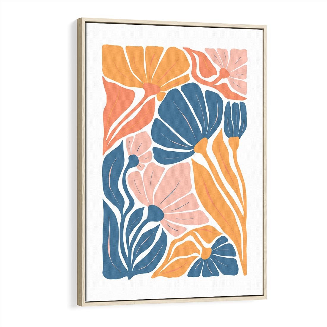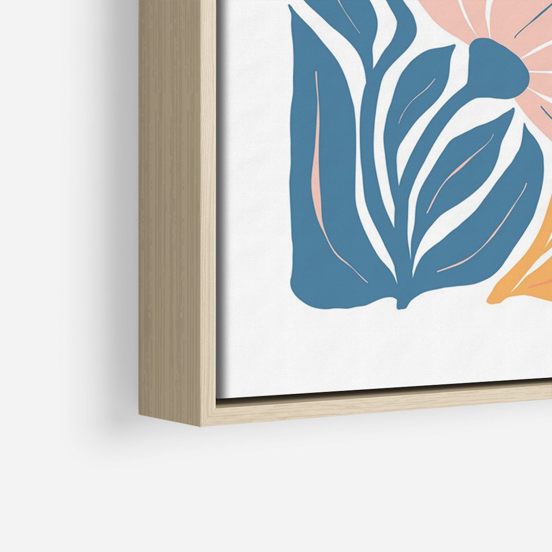 Ten minimalistyczny plakat ukazuje kwiaty i rośliny w delikatnych pastelowych odcieniach, tworząc harmonijną kompozycję. Sztuka ta emanuje spokojem i równowagą natury, dodając subtelnej estetyki do przestrzeni.