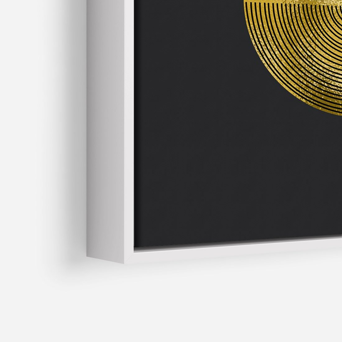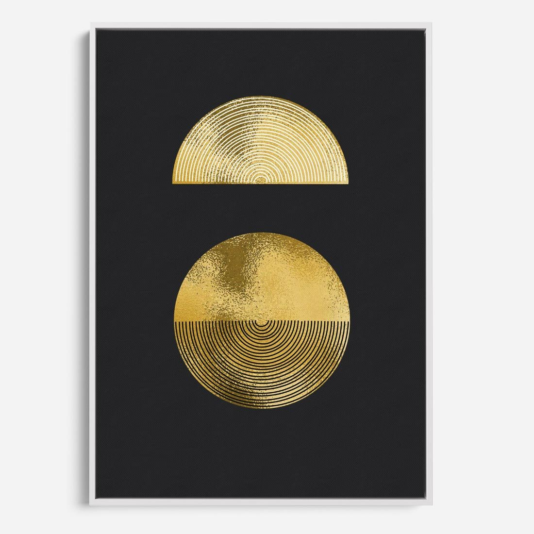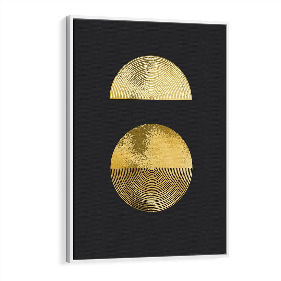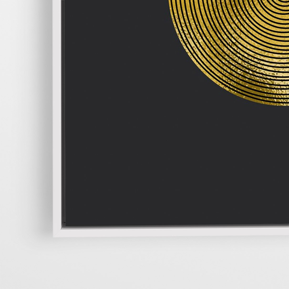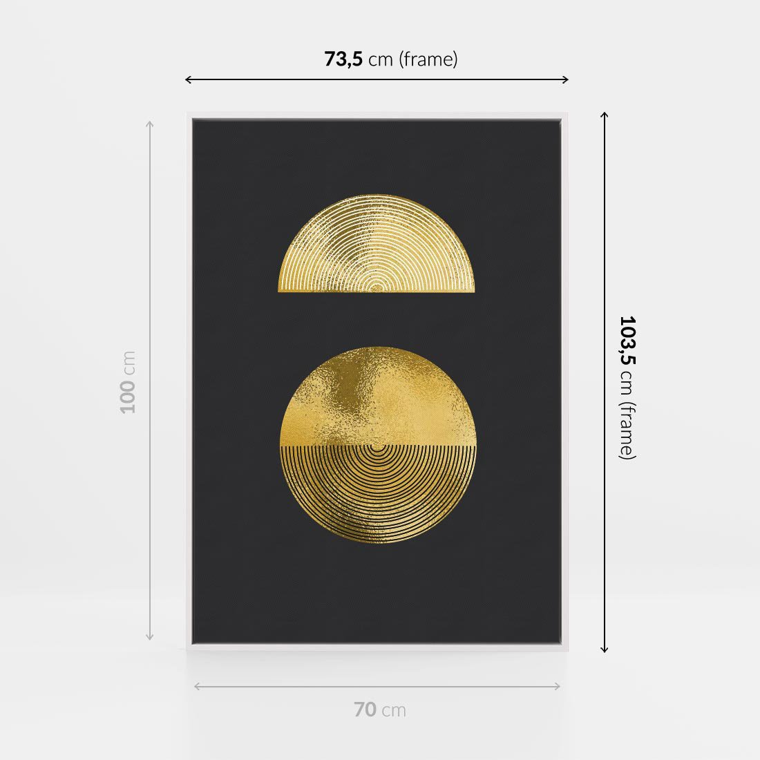 Obraz w ramie 70x100 - Migotliwe Przeniknięcia - złote koła, czarne tło - rama biała