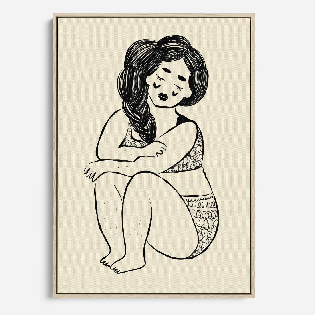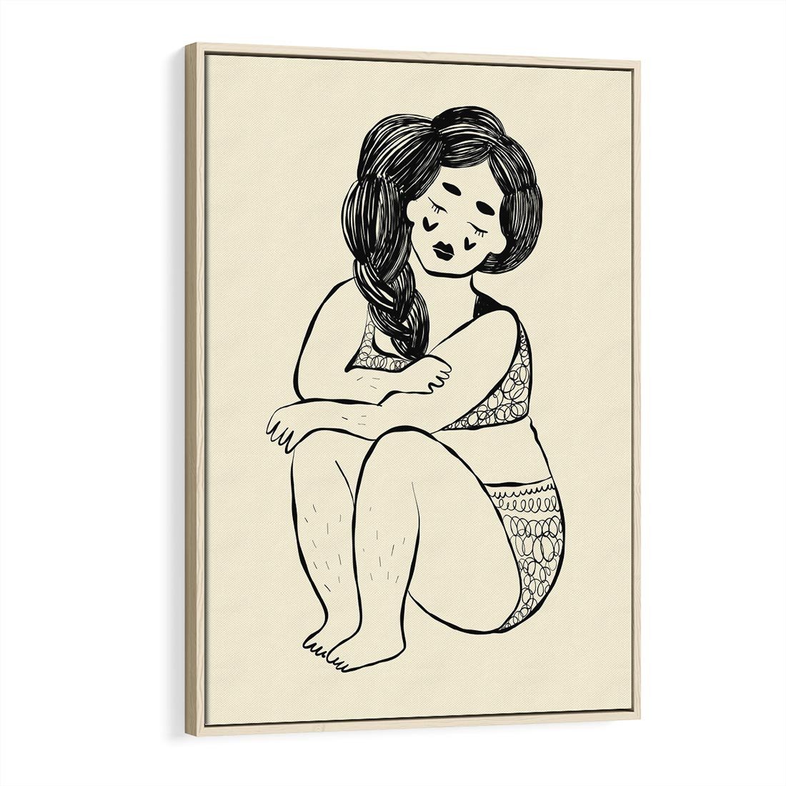 Ten nowoczesny minimalistyczny rysunek ukazuje delikatną siłę kobiecej postaci w bieliźnie, podkreślając ważność akceptacji i piękna w jego najczystszej formie.