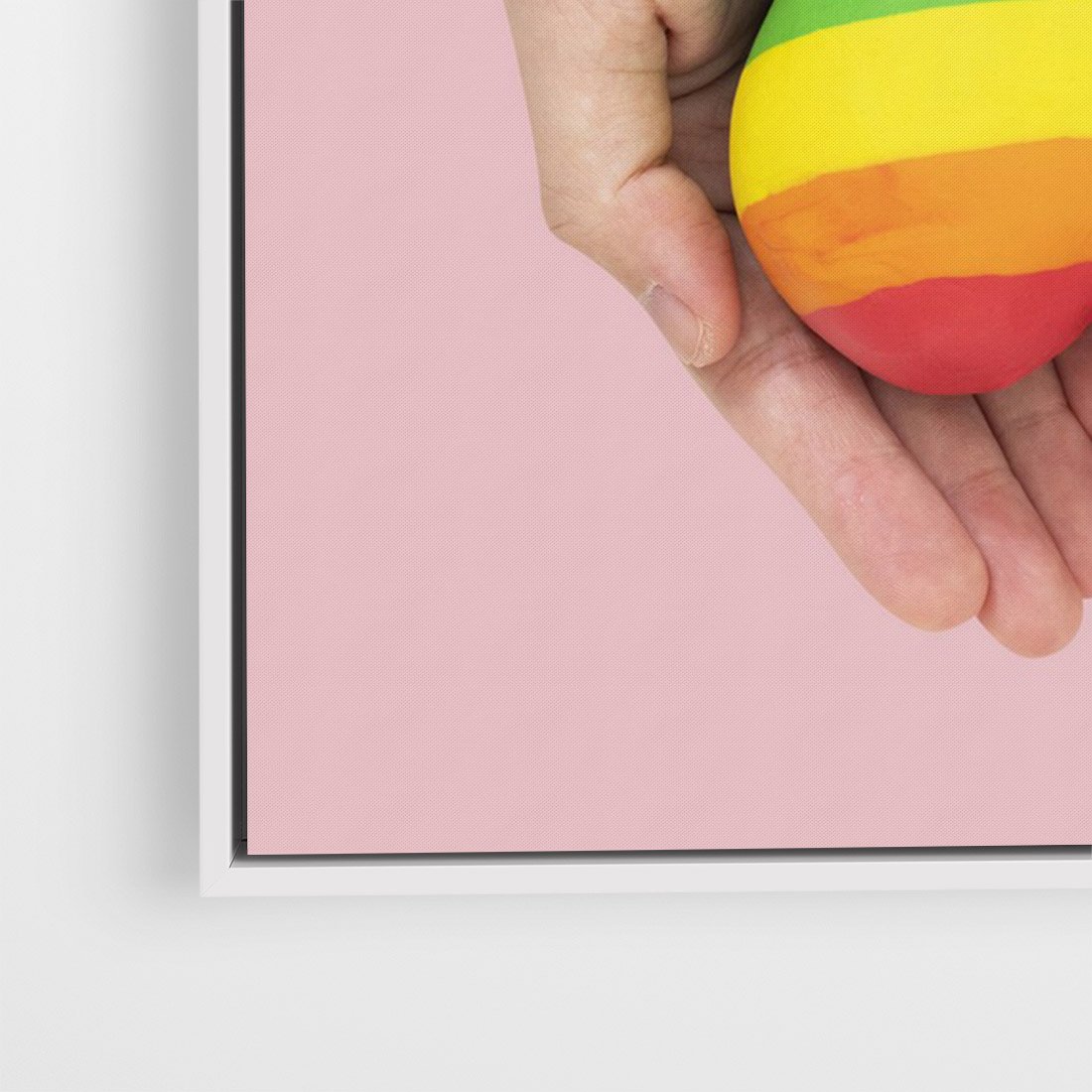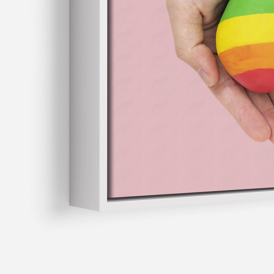 Obraz w ramie 70x100 - Miłość na Dłoniach - zdjęcie, dłonie trzymają ulepione tęczowe serce - rama biała