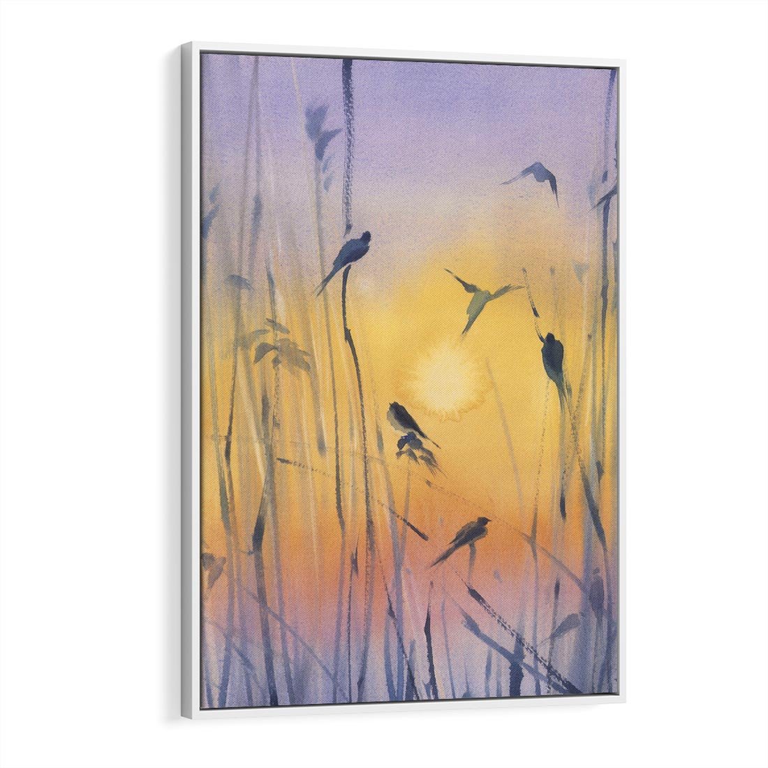 Ta akwarela ukazuje piękny wschód słońca w szuwarach, gdzie trawy ukrywają się w mglistym poranku. Ptaki siedzące na tataraku dodają uroku temu pejzażowi. Mistyka Poranka nad Szuwarami ożywia fioletowo-złote odcienie, tworząc aurę tajemniczości i spokoju, która przenosi nas w chwilę magicznego i naturalnego piękna.