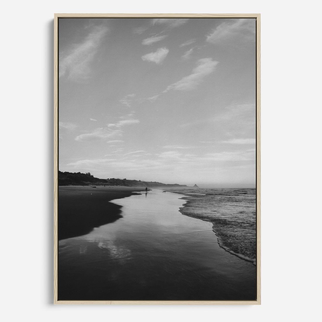 To czarno-białe zdjęcie oddaje urok nadmorskiego klimatu. Widok plaży i morza, utrwalony w monochromatycznej tonacji, nadaje temu obrazowi nostalgii i atmosfery spokoju. To idealna dekoracja dla tych, którzy kochają nadmorskie widoki i chcą przenieść kawałek plażowej atmosfery do swojego wnętrza.