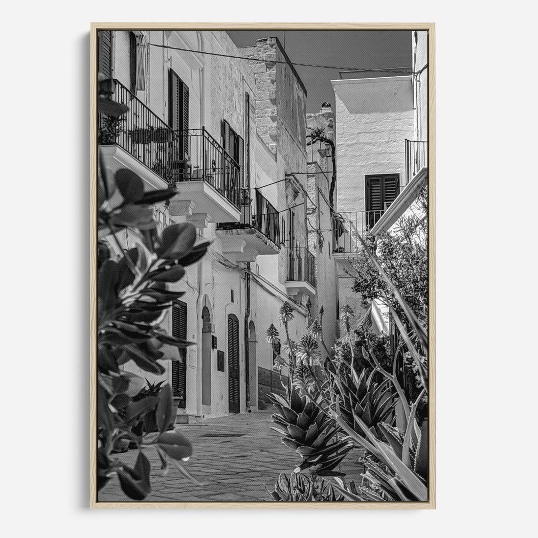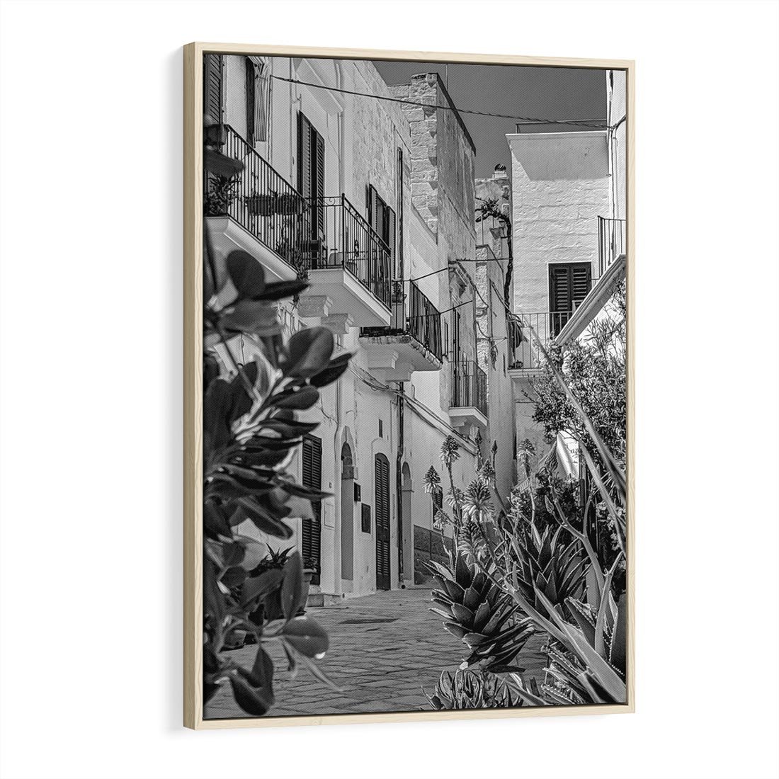 Obraz w ramie 70x100 - Nadmorska Uliczka - czarno białe zdjecie, uliczka w nadmorskim mieście - rama drewno