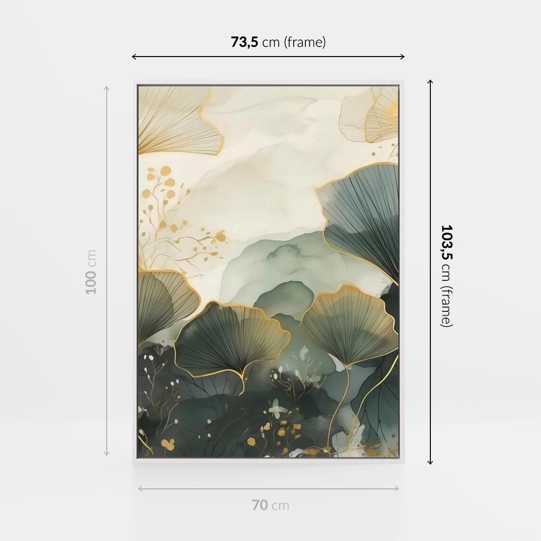 Ten malowniczy obraz przedstawia liście miłorzębu japońskiego w zgaszonej zielonej tonacji, z pięknym akwarelowym efektem. Złote elementy dodają subtelnej elegancji, nadając kompozycji wyjątkowego uroku. To artystyczne dzieło sztuki wprowadzi wspaniały akcent natury do Twojego wnętrza, zachwycając oryginalnością i delikatnością.
