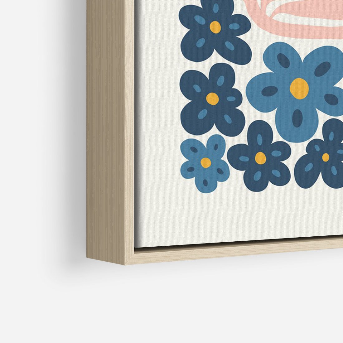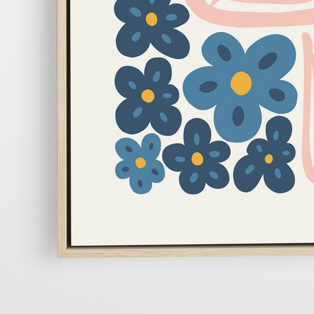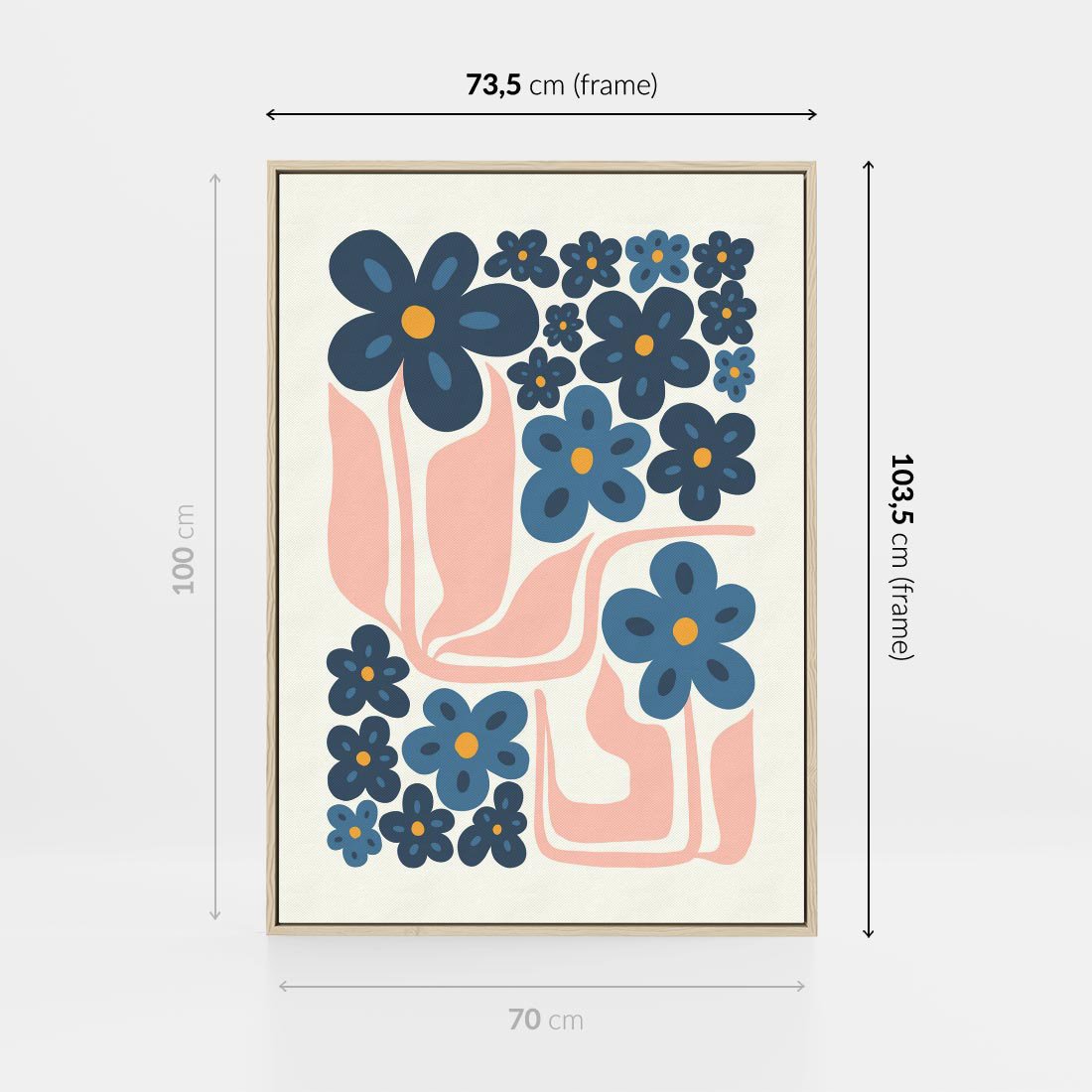 Ta nowoczesna abstrakcja łączy niebieskie kwiaty niezapominajki z delikatnymi pastelowymi odcieniami. Kompozycja zachęca do kontemplacji, wprowadzając spokój i harmonię do wnętrza.