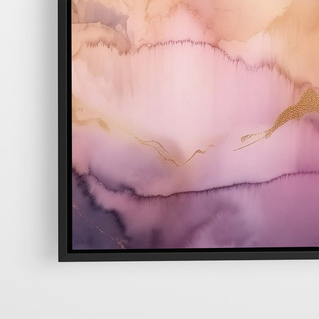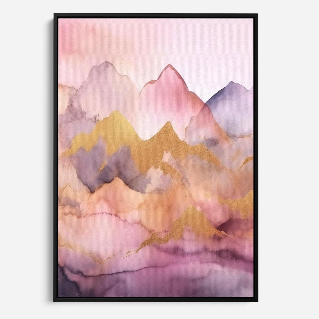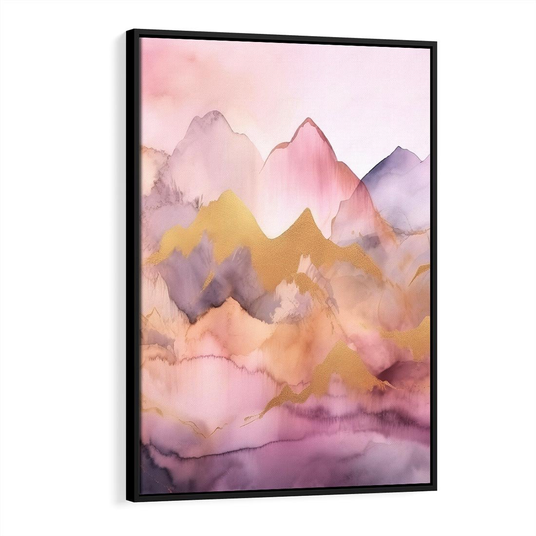 Ten obraz przedstawia pastelowe, różowe góry z akwarelowymi detalami w złotych tonach. Sztuka nowoczesna emanuje spokojem i subtelnością, nadając wnętrzom salonu lub sypialni unikalny urok. Odcienie różu i złota tworzą harmonijną kompozycję, która wzbogaca każdą przestrzeń.