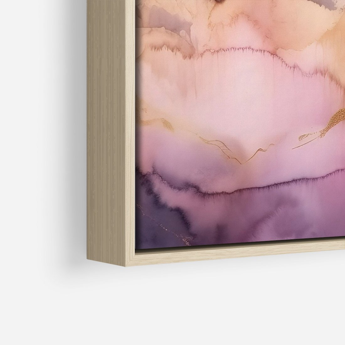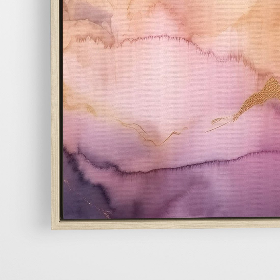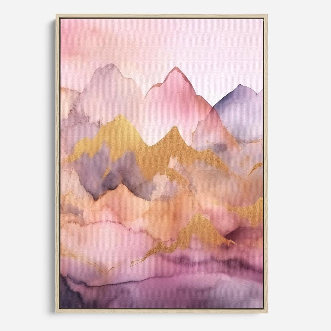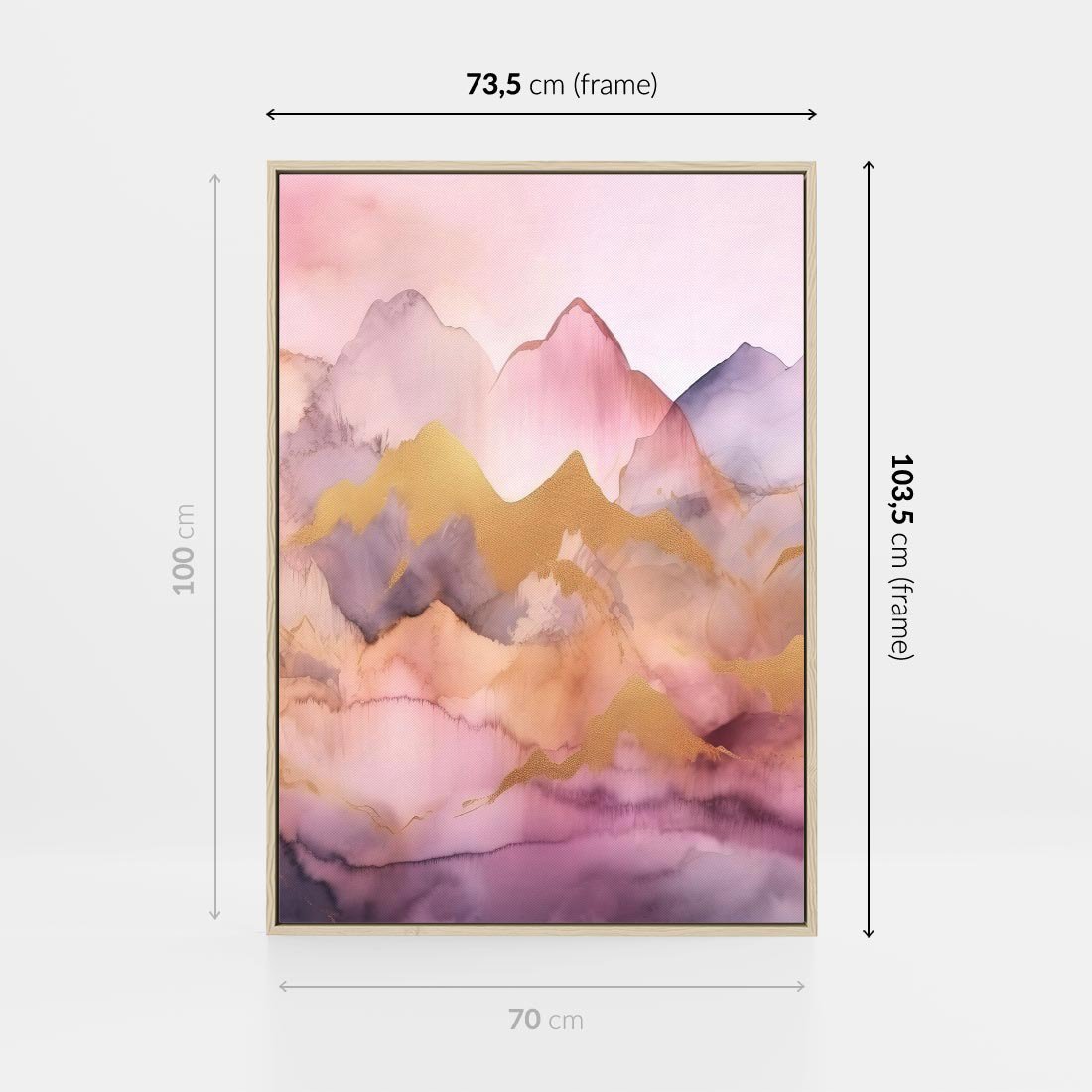 Ten obraz przedstawia pastelowe, różowe góry z akwarelowymi detalami w złotych tonach. Sztuka nowoczesna emanuje spokojem i subtelnością, nadając wnętrzom salonu lub sypialni unikalny urok. Odcienie różu i złota tworzą harmonijną kompozycję, która wzbogaca każdą przestrzeń.