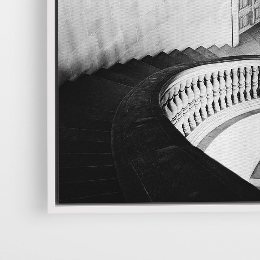 Obraz w ramie 70x100 - Po Schodach w Dół - czarno białą fotgrafia, zakręcone schody w starek kamienicy - rama biała