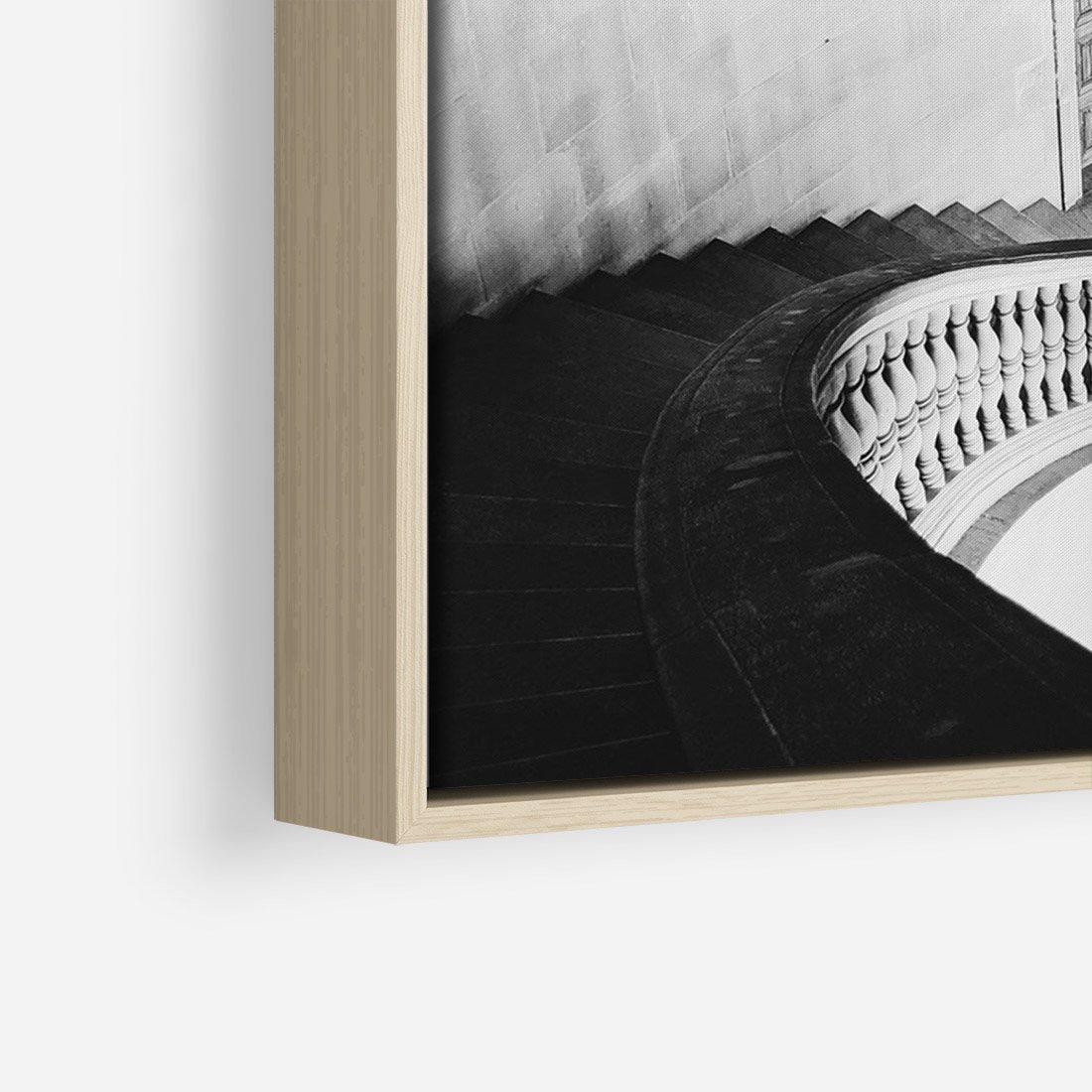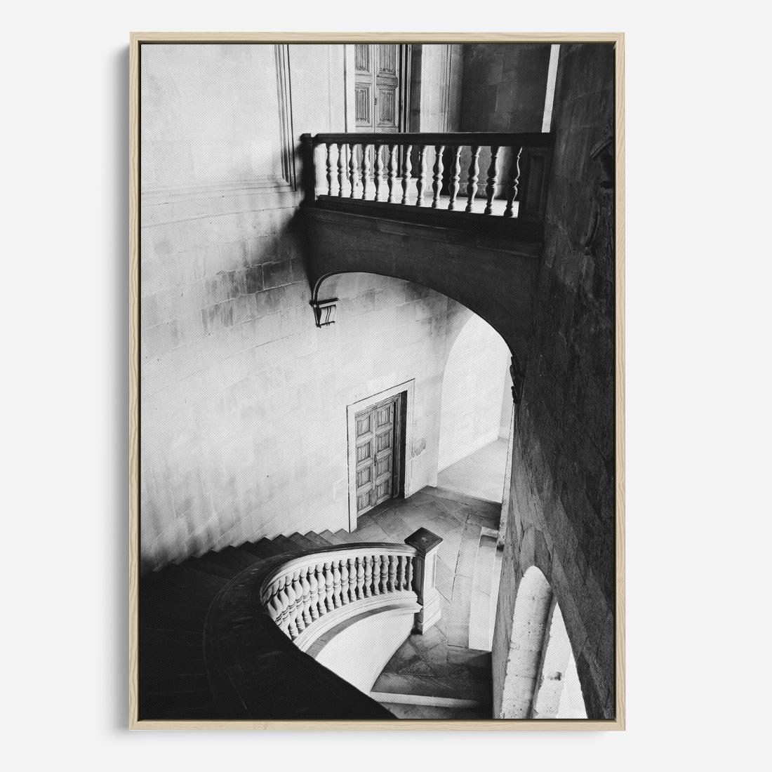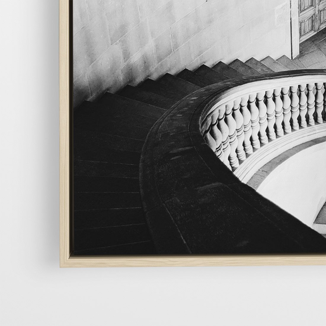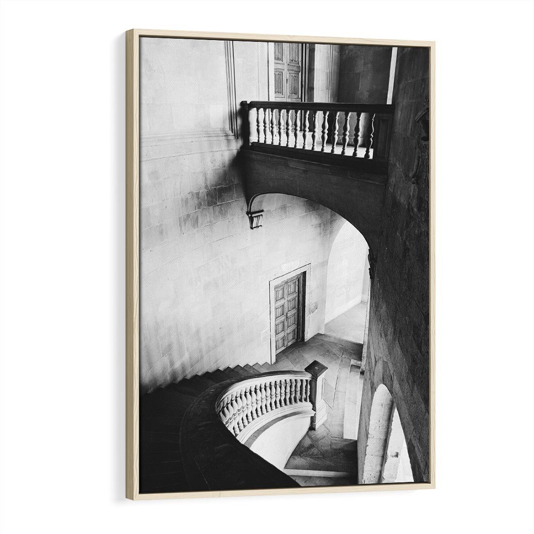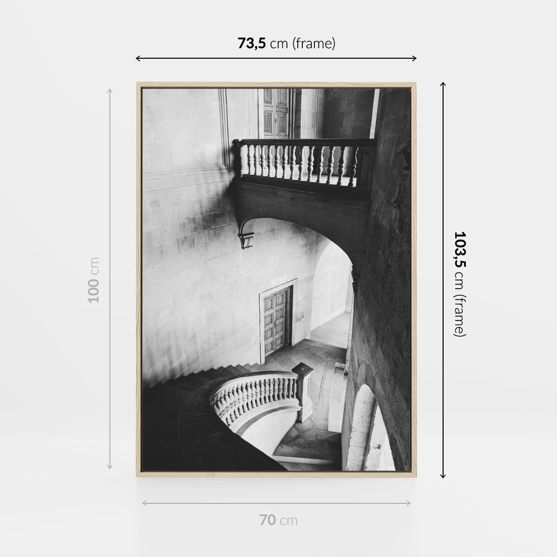 Obraz w ramie 70x100 - Po Schodach w Dół - czarno białą fotgrafia, zakręcone schody w starek kamienicy - rama drewno