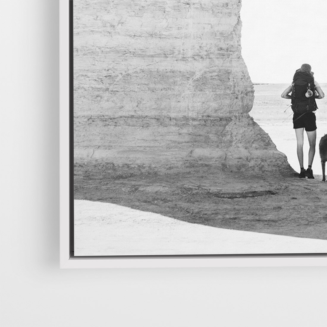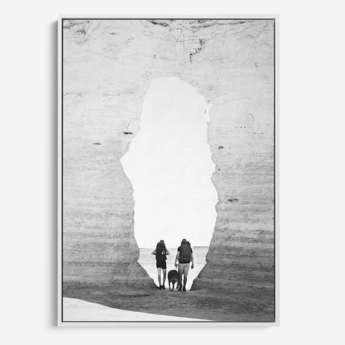 Ta czarno-biała fotografia przedstawia dwójkę podróżników, którzy eksplorują skaliste wybrzeże z psem na smyczy. W oddali rozciąga się widok na morze, tworząc malowniczą scenerię. Fotografia ta odzwierciedla ducha przygody i wspólnej podróży oraz piękno przyrody. Czarno-biała paleta kolorów nadaje zdjęciu klasyczny i nostalgiczny charakter, podkreślając jednocześnie atmosferę i emocje chwili. To doskonały element dekoracyjny do wnętrz, które cenią sobie podróżniczy duch i piękno przyrody.
