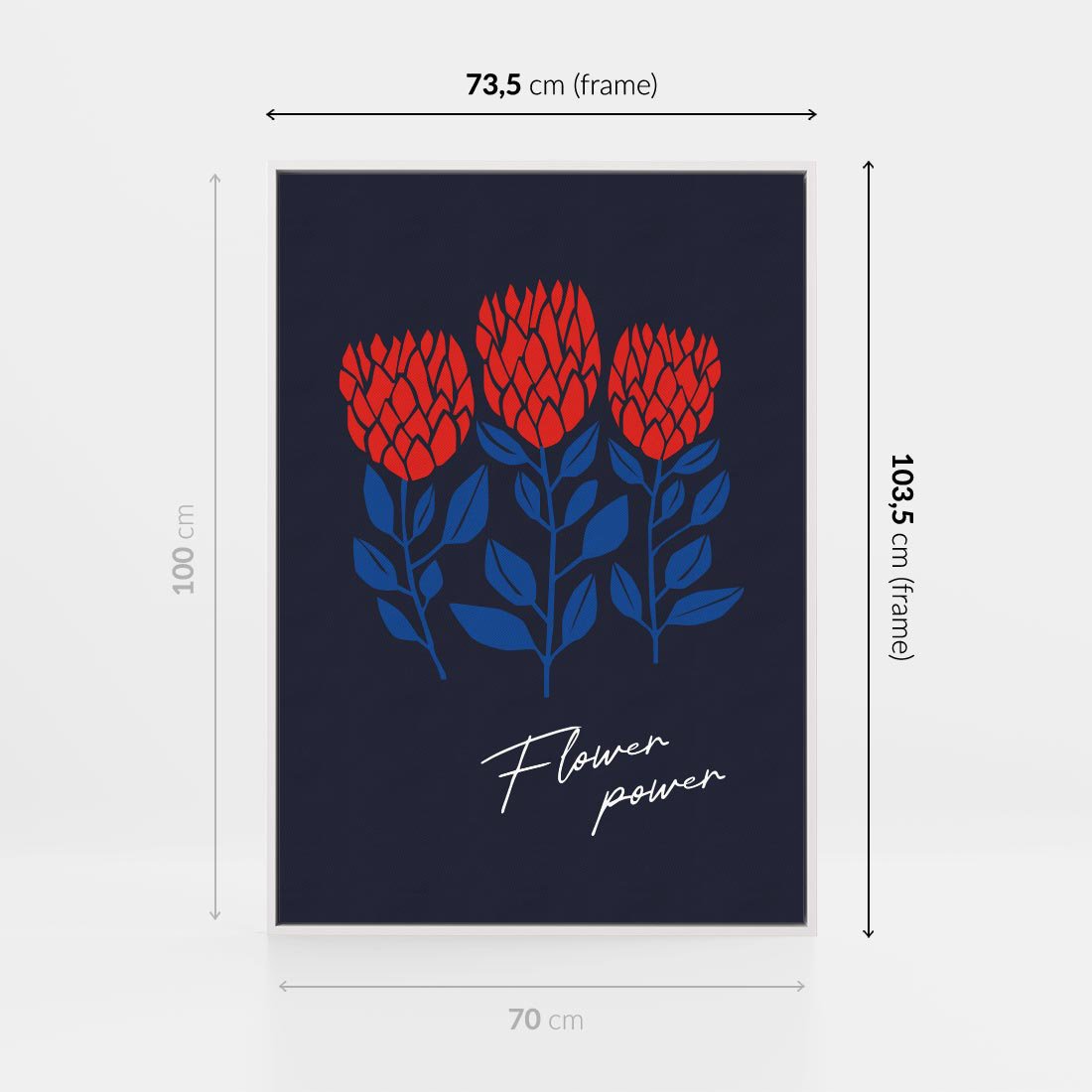 Ten plakat emanuje duchem Flower Power, prezentując abstrakcyjne czerwone kwiaty na głębokim granatowym tle. Z minimalistyczną typografią podkreśla to odważne i kolorowe przesłanie, które przypomina o sile natury i pięknie kwiatów w kreatywny i nowoczesny sposób.