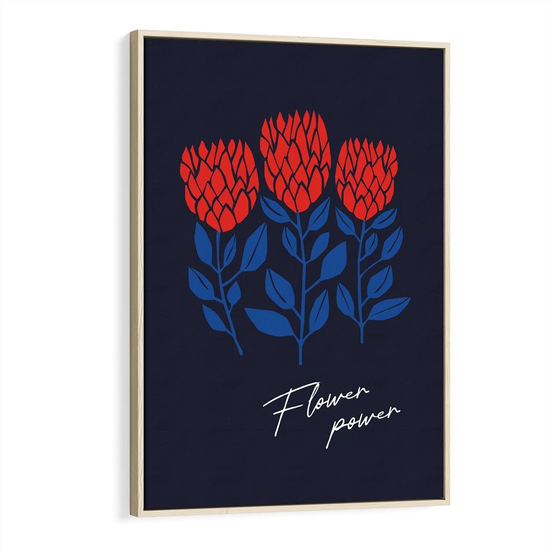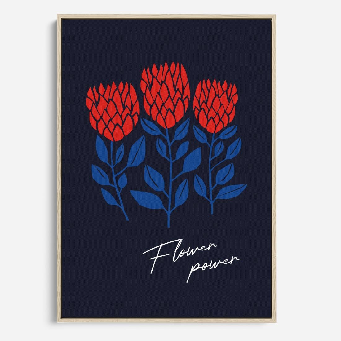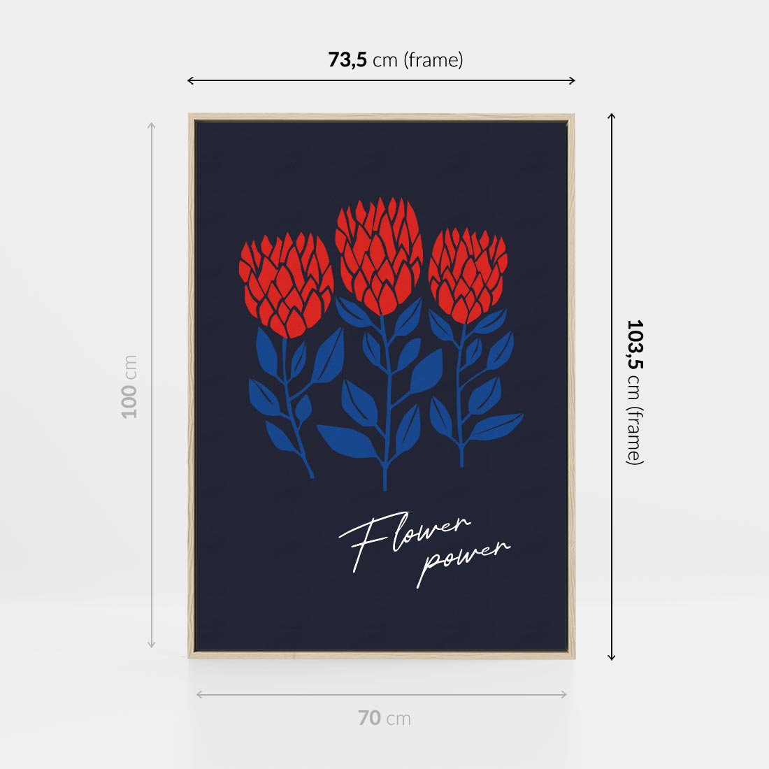 Ten plakat emanuje duchem Flower Power, prezentując abstrakcyjne czerwone kwiaty na głębokim granatowym tle. Z minimalistyczną typografią podkreśla to odważne i kolorowe przesłanie, które przypomina o sile natury i pięknie kwiatów w kreatywny i nowoczesny sposób.