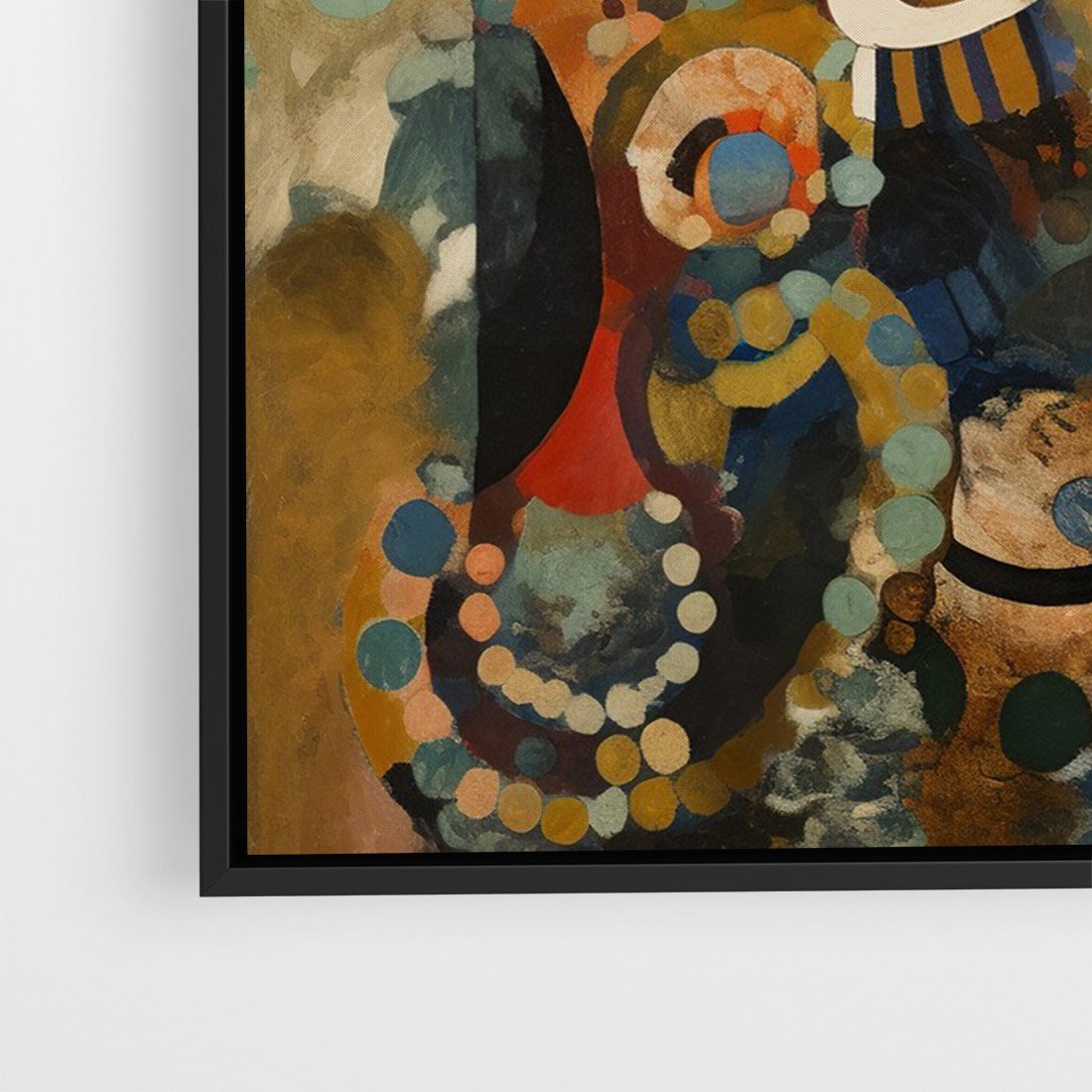 Ten abstrakcyjny obraz jest pełen żywych kolorów i drobnych elementów, które tworzą zaskakującą całość. Ich kształty układają się w fascynującą kompozycję, która wciąga i zachwyca. To dzieło sztuki, które budzi ciekawość i intryguje.